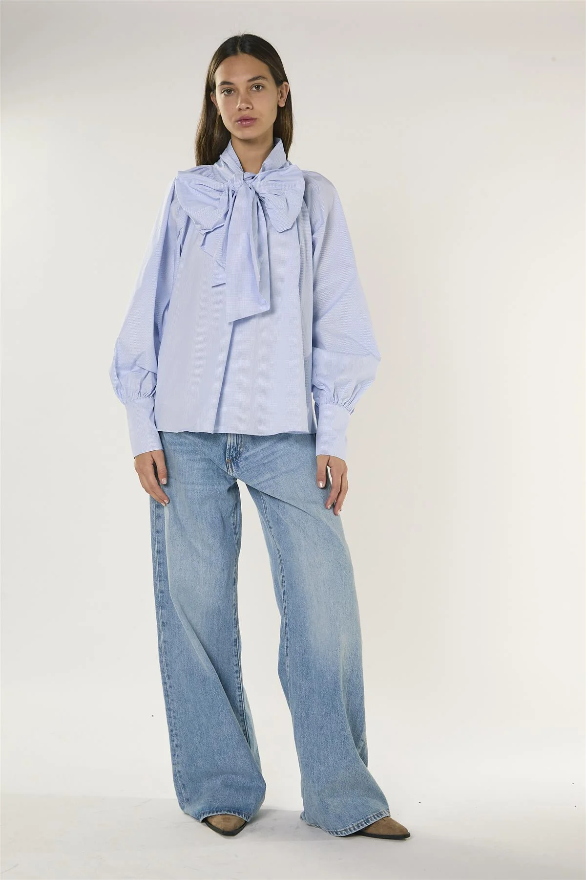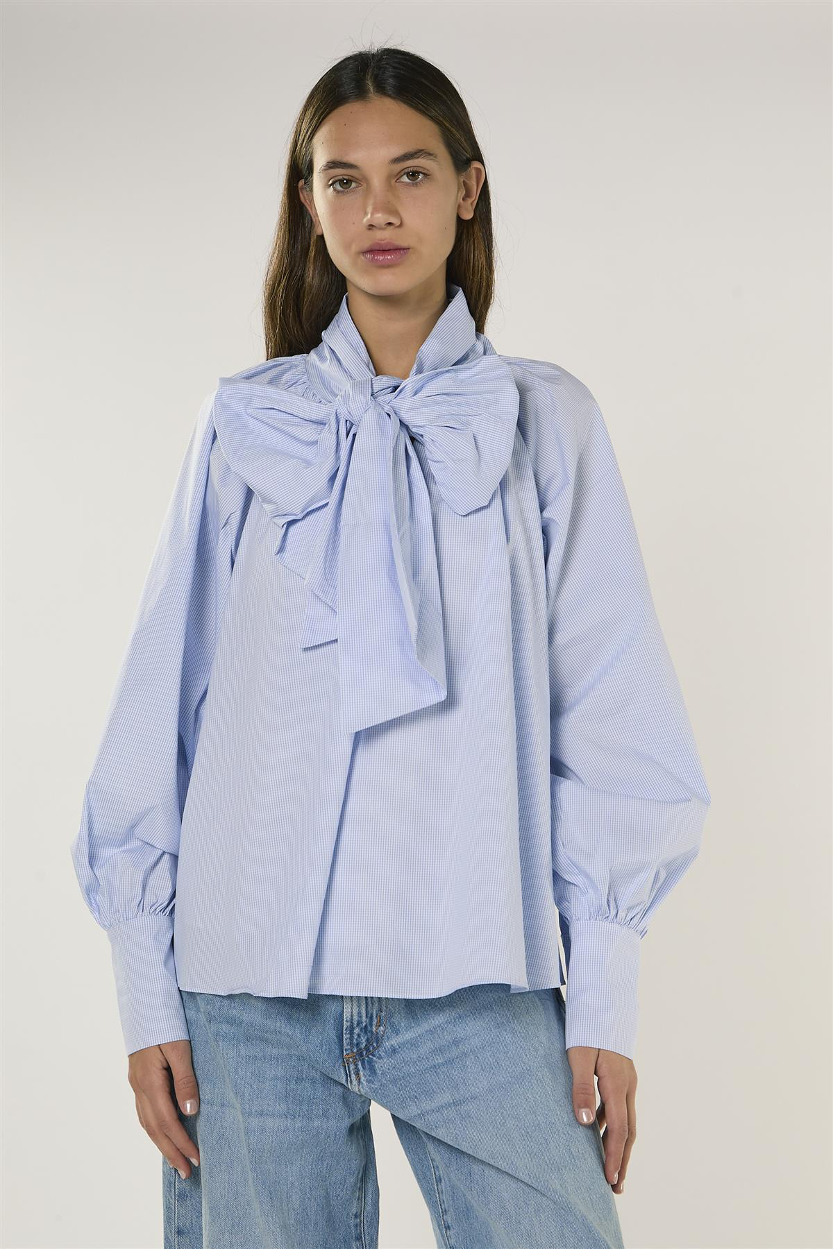 Struttura morbida e raffinata si fondono in questa blusa blu a micro quadri con maniche raglan, donando un tocco di eleganza al tuo look quotidiano. Il fiocco aggiunge un tocco di grazia che impreziosisce la fantasia a quadri. Caratterizzata da un volume sia nelle maniche che nel corpo, offre una silhouette morbida e drappeggiata, leggera e piacevole da indossare. Ideale da abbinare a pantaloni sartoriali o jeans.