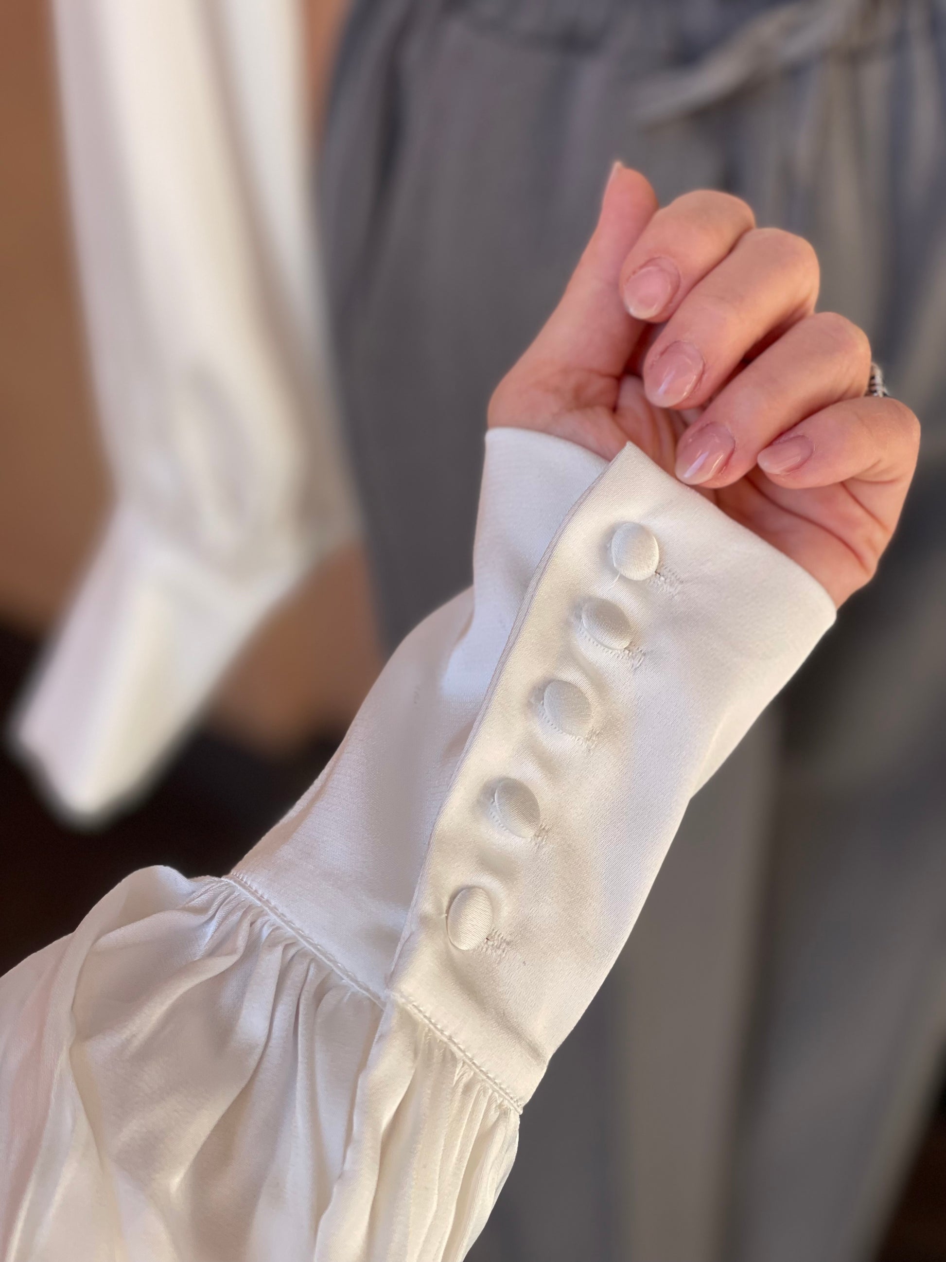 Camicia bianca con grande fiocco al collo , manica a palloncino con polsino alto e bottoni foderati. La camicia ha i bottoni sul davanti. Bellissima sia con look elegante che con un jeans per un look più casual. Vestibilitá comoda.