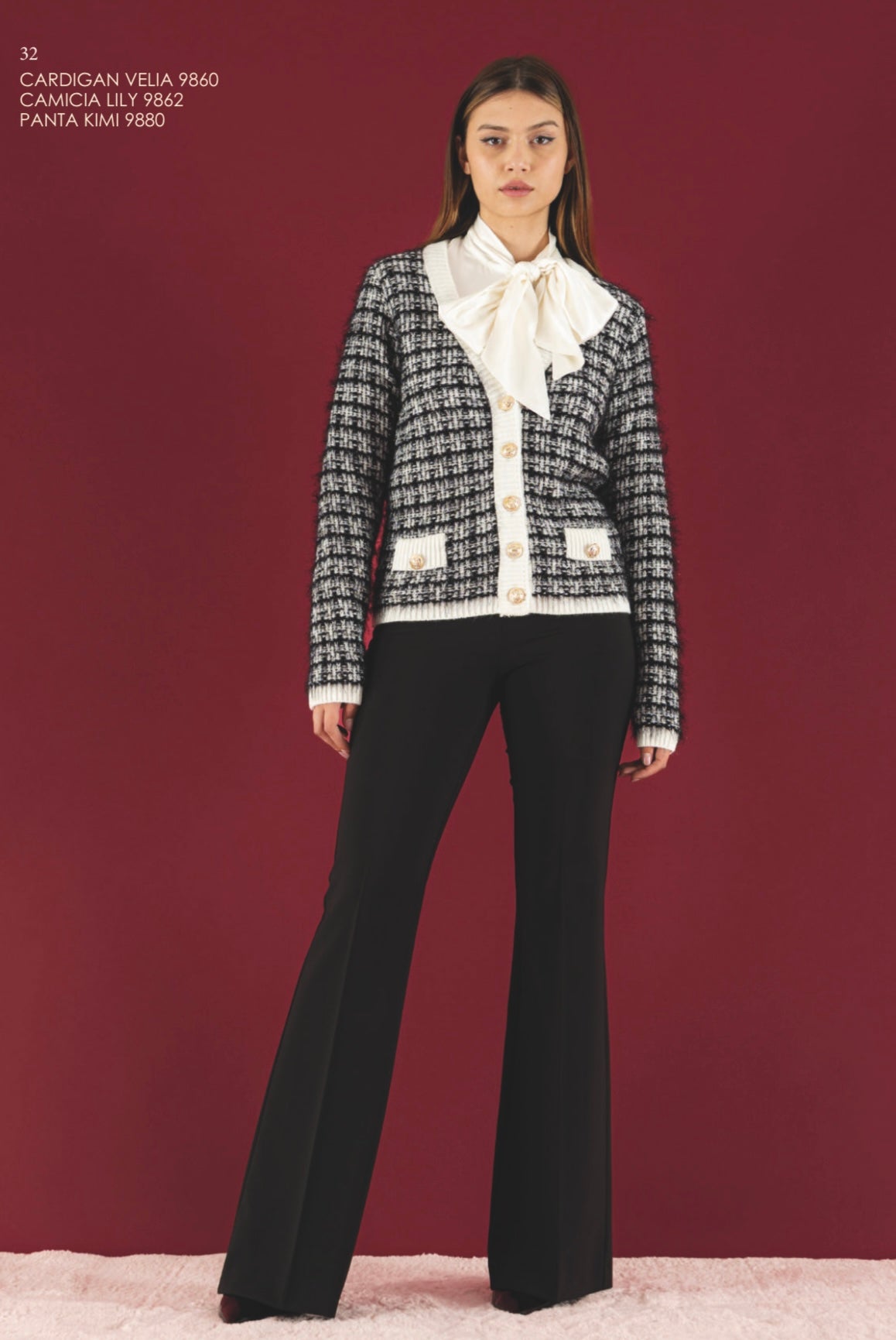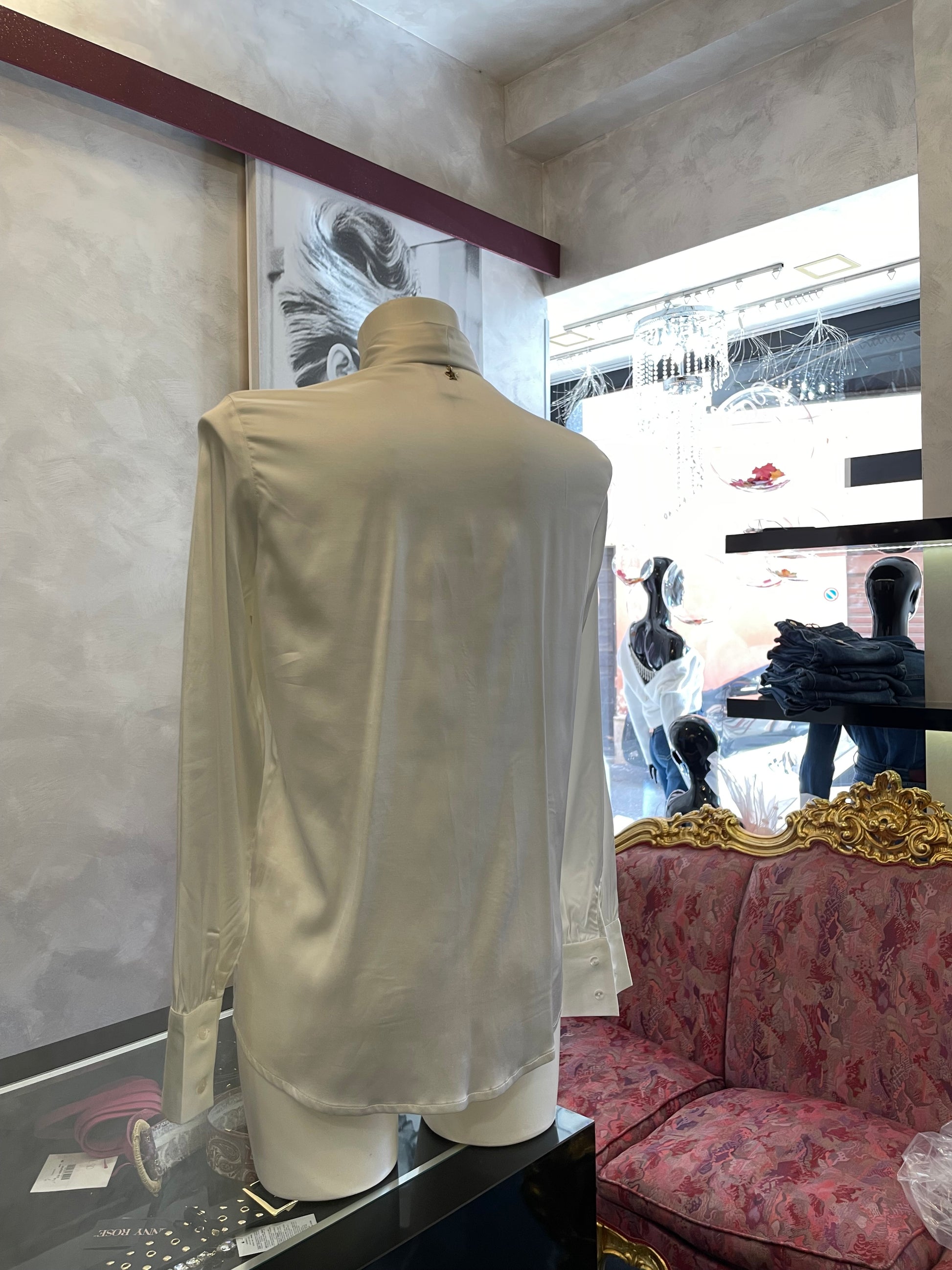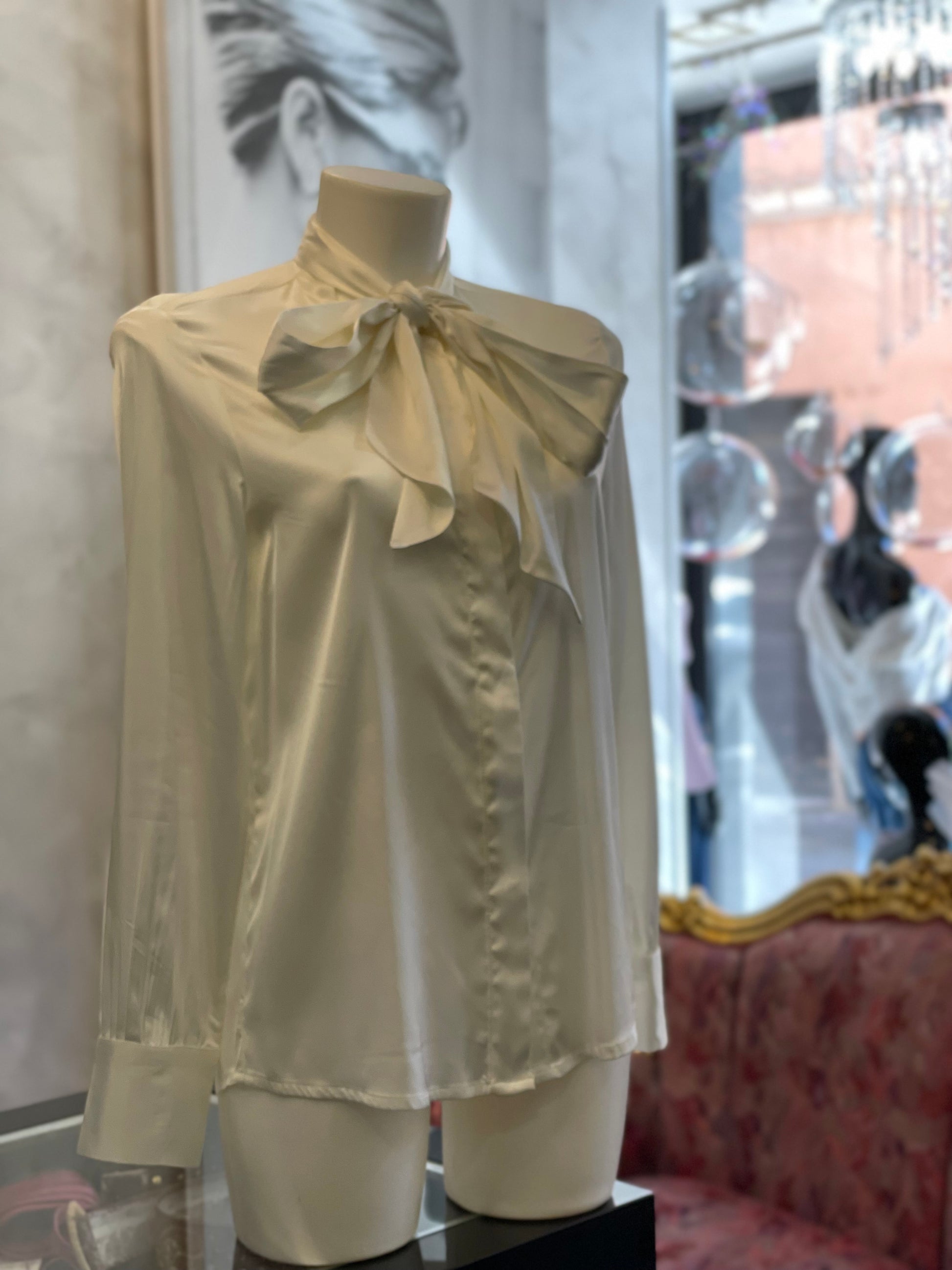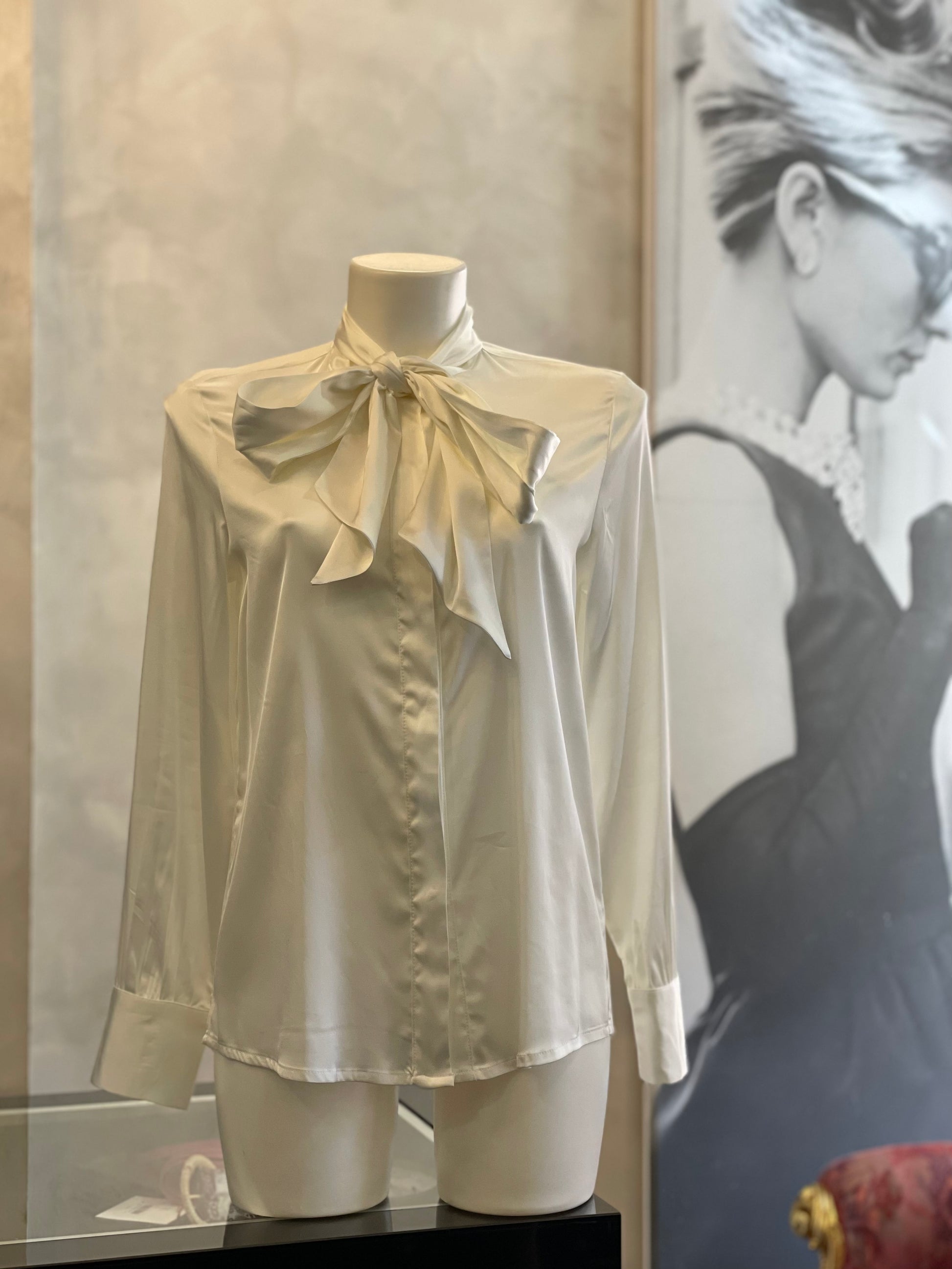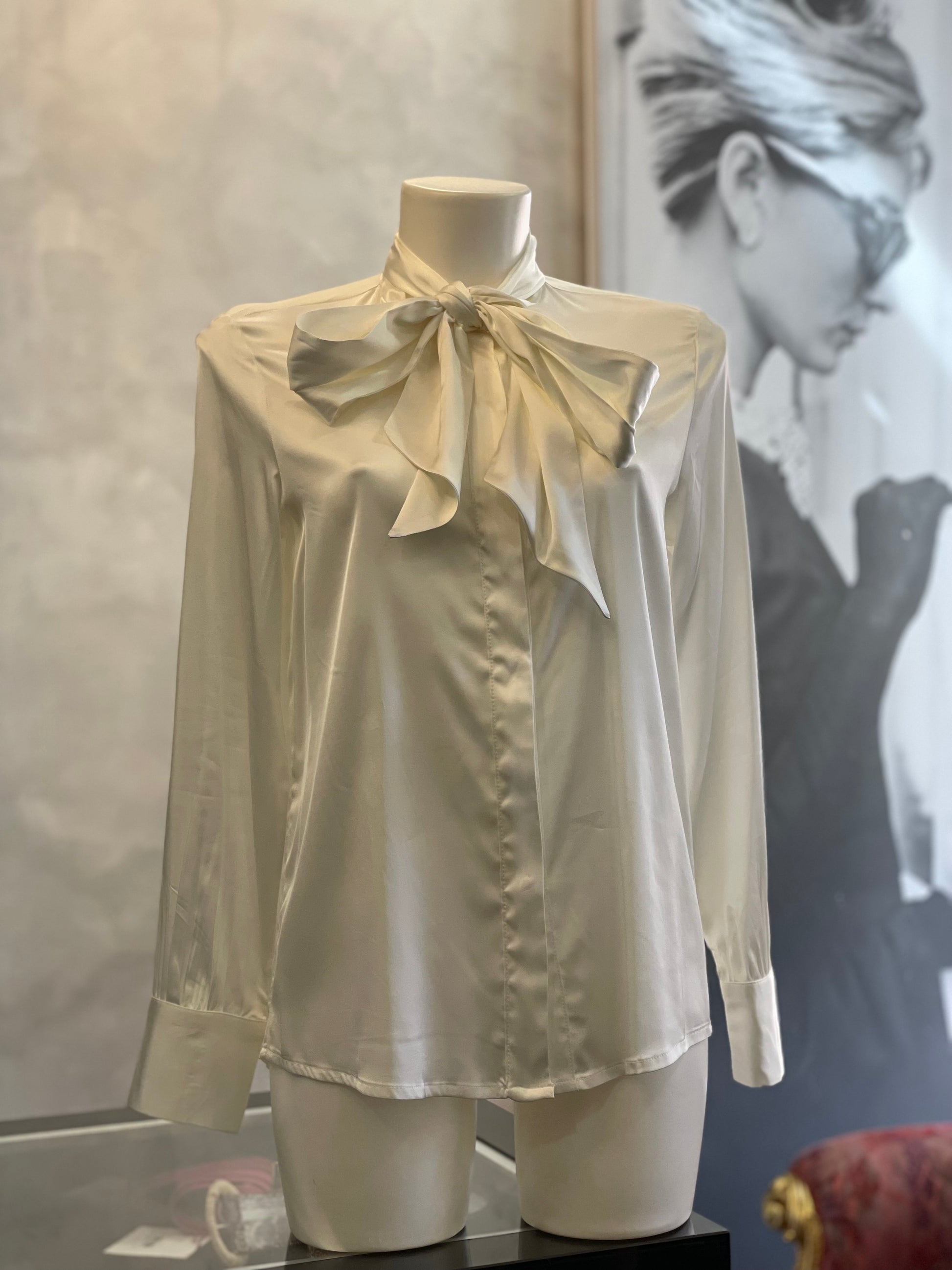 Camicia in raso raffinata ed elegante da abbinare a look per occasioni speciali o da sdrammatizzare con look più casual , arricchita con fiocco al collo.