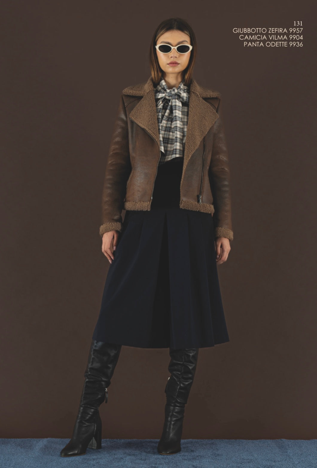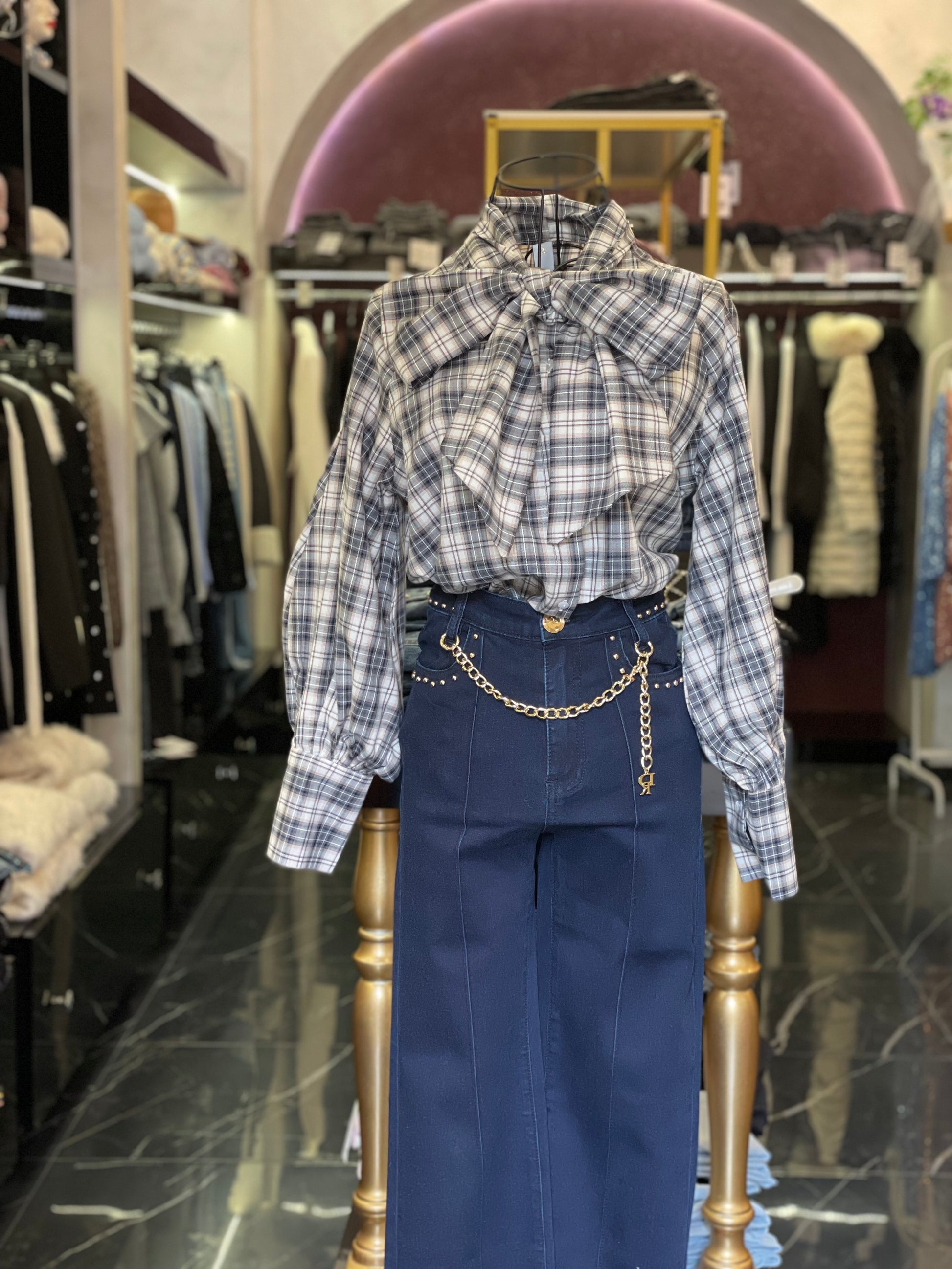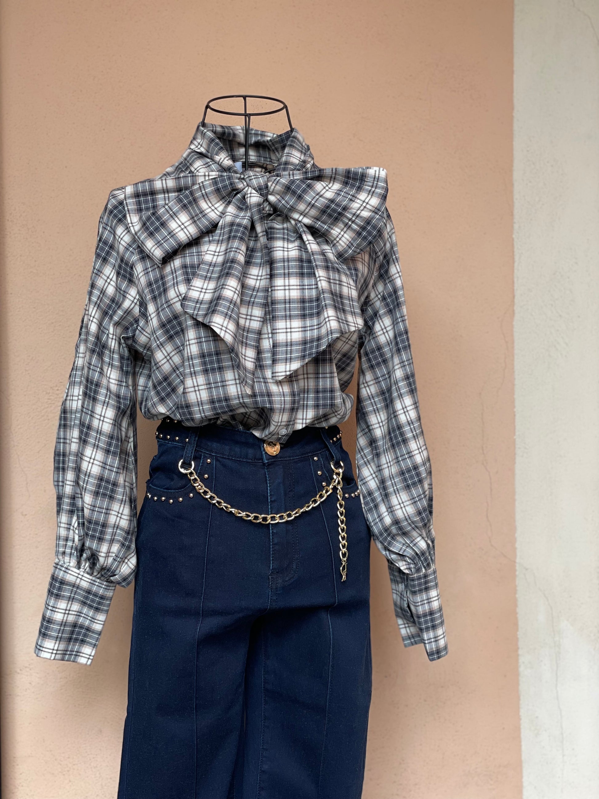 Camicia stampa quadri con fiocco al collo e ampia manica a palloncino.