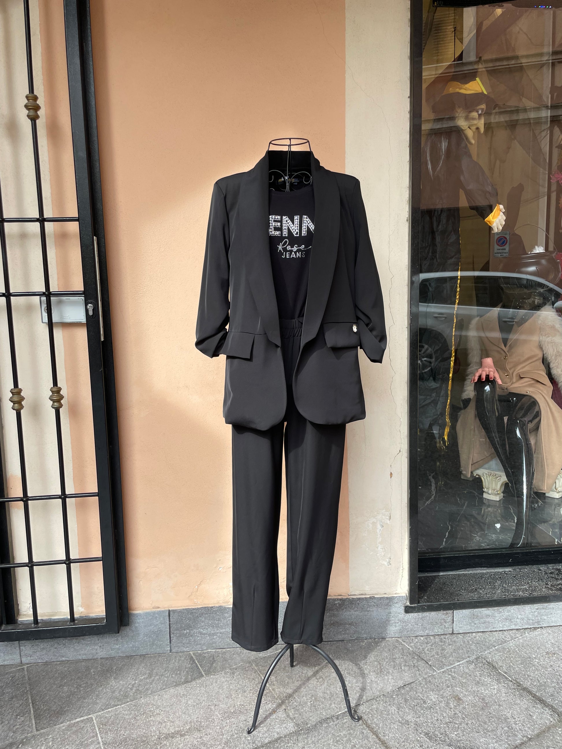 Completo Tailleur composto da Blazer foderato interamente e pantalone comodo con elastico in vita.