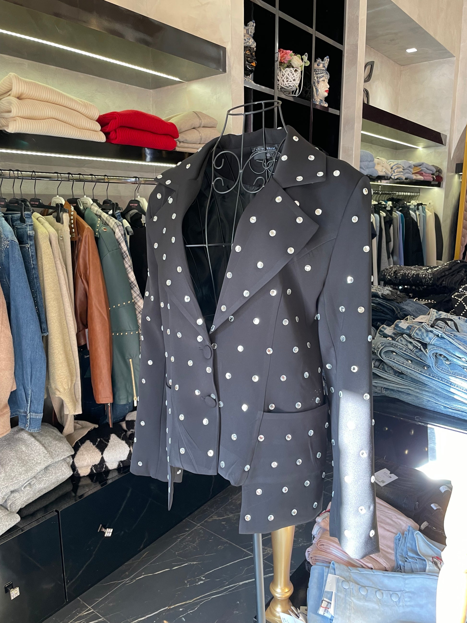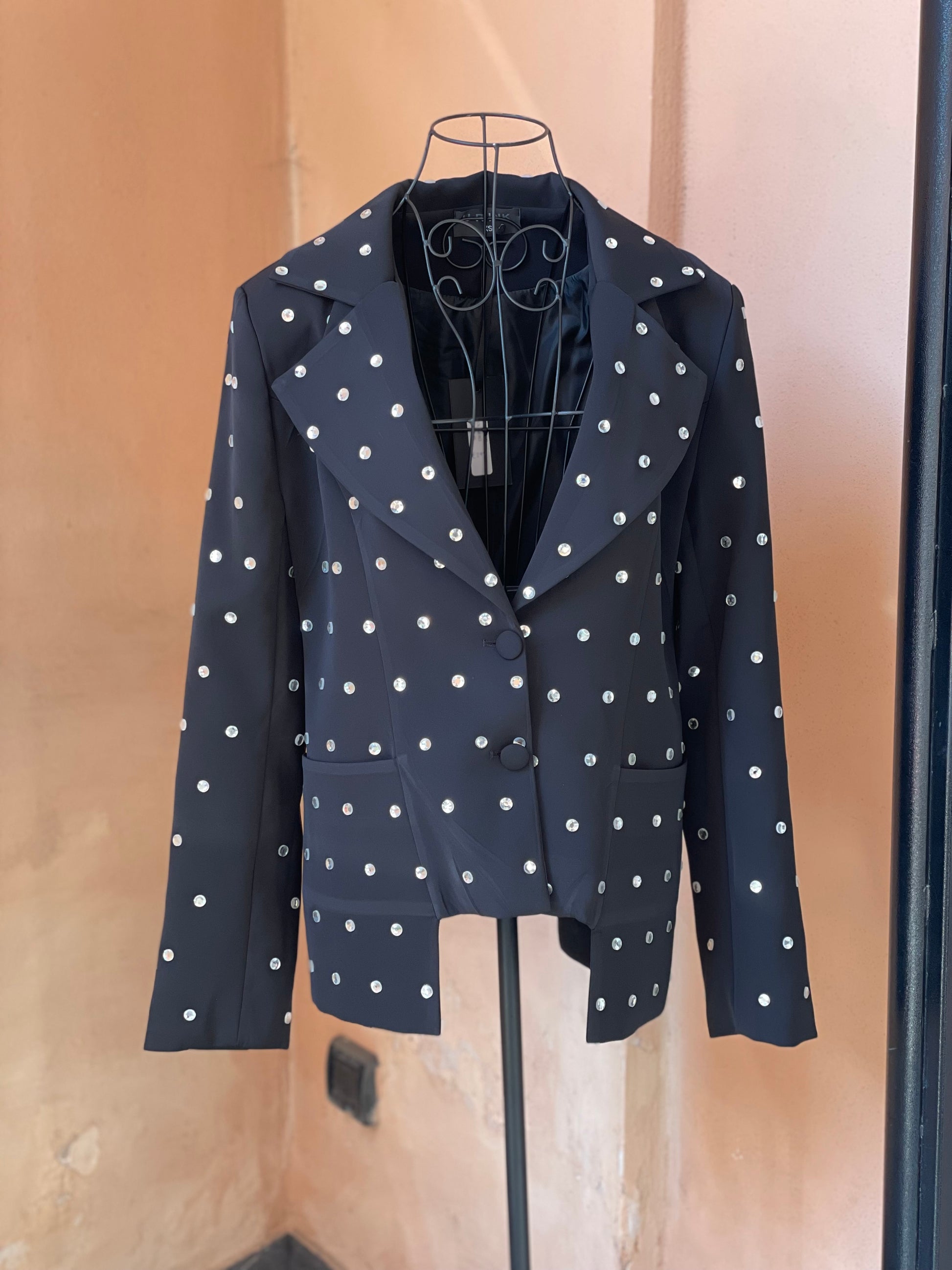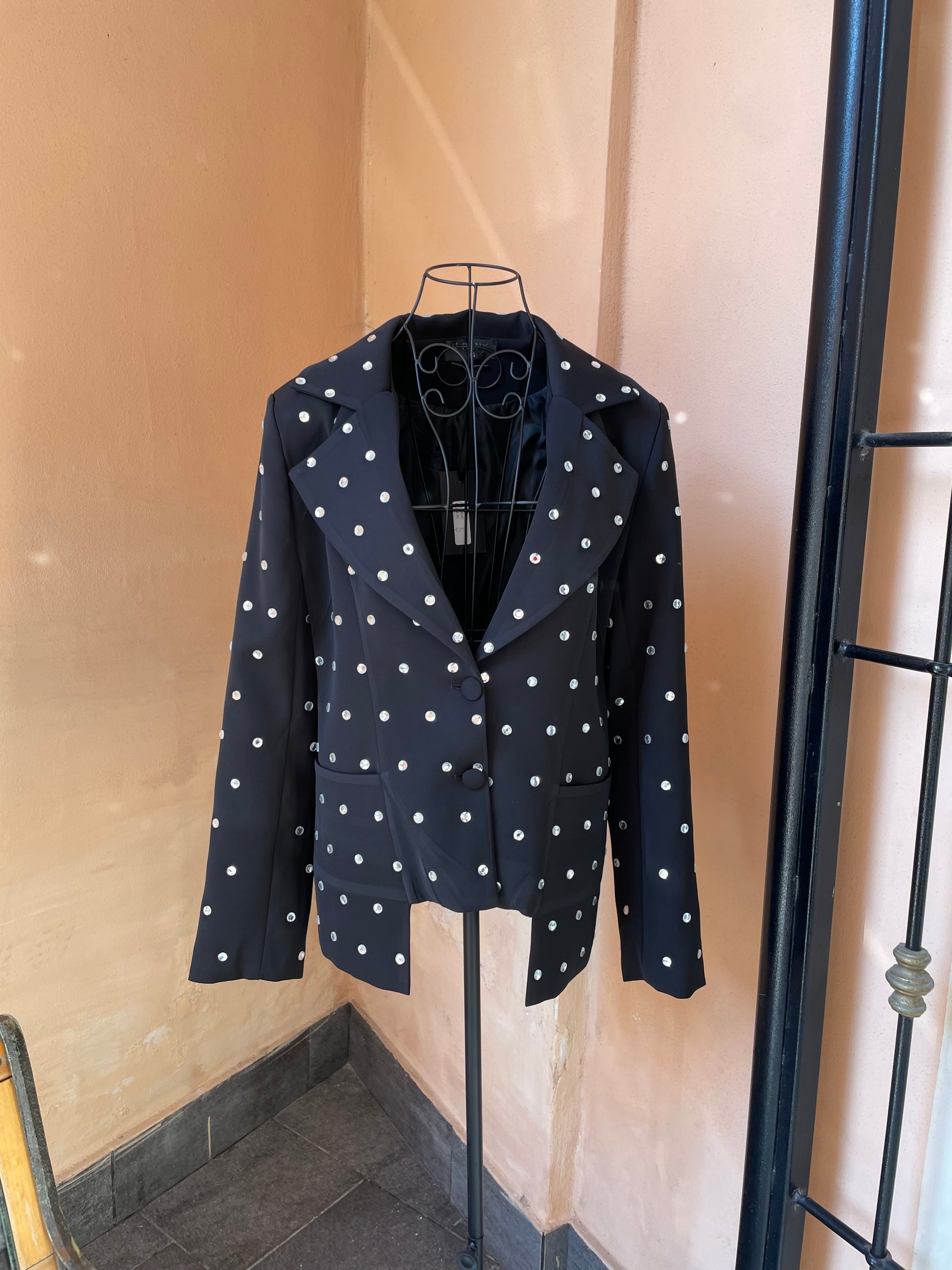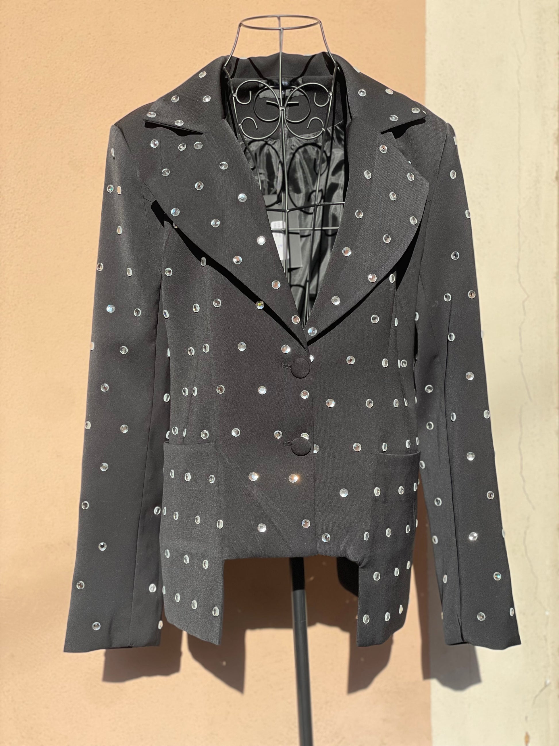 Giacca nera foderata internamente, ricca di pietre che ti faranno brillare come non mai. Giacca da abbinare a look eleganti da sera ma anche da sdrammatizzare con un jeans. Questa giacca ha un taglio sulle tasche irregolare voluto per renderla ancora più particolare.