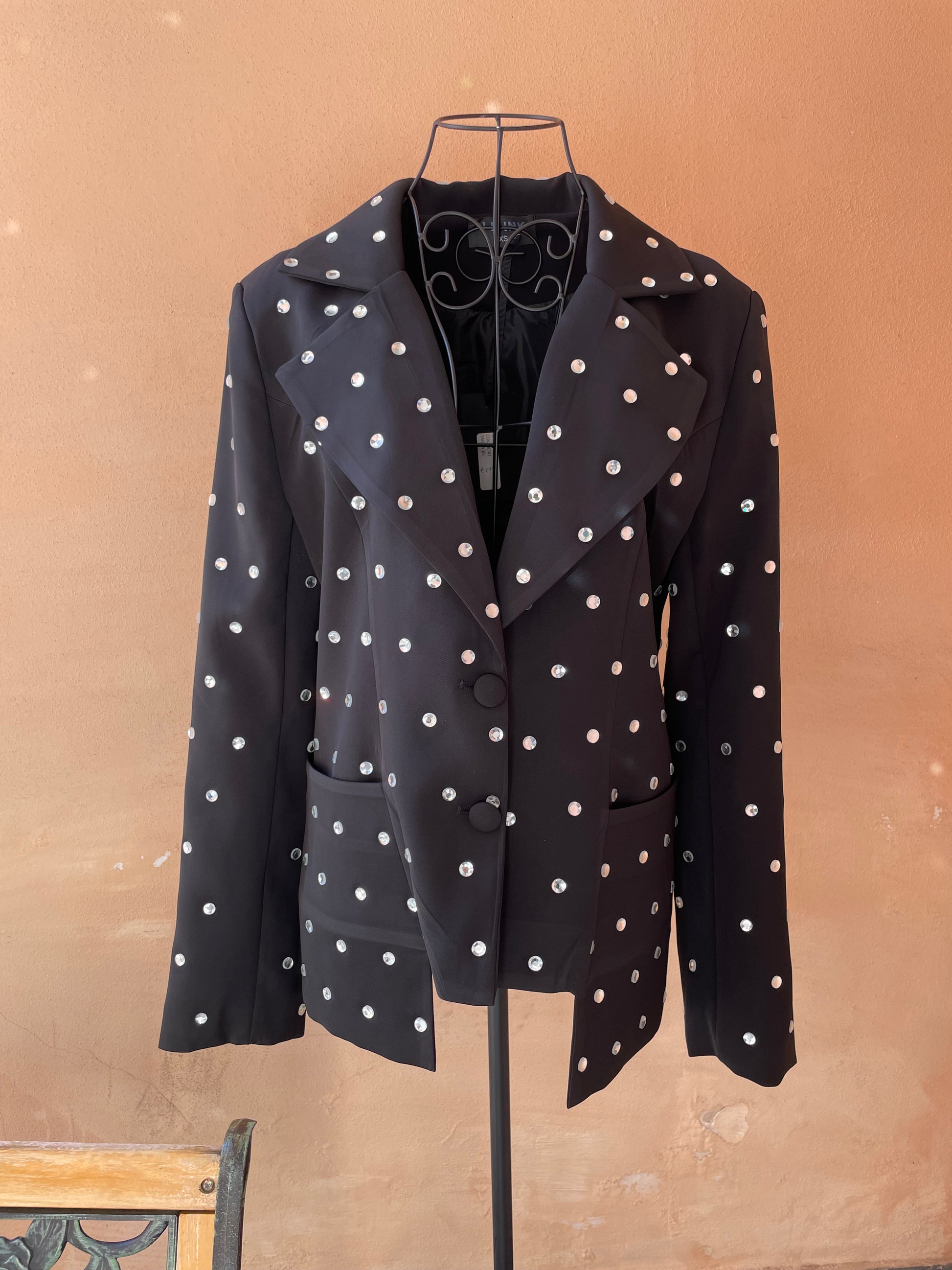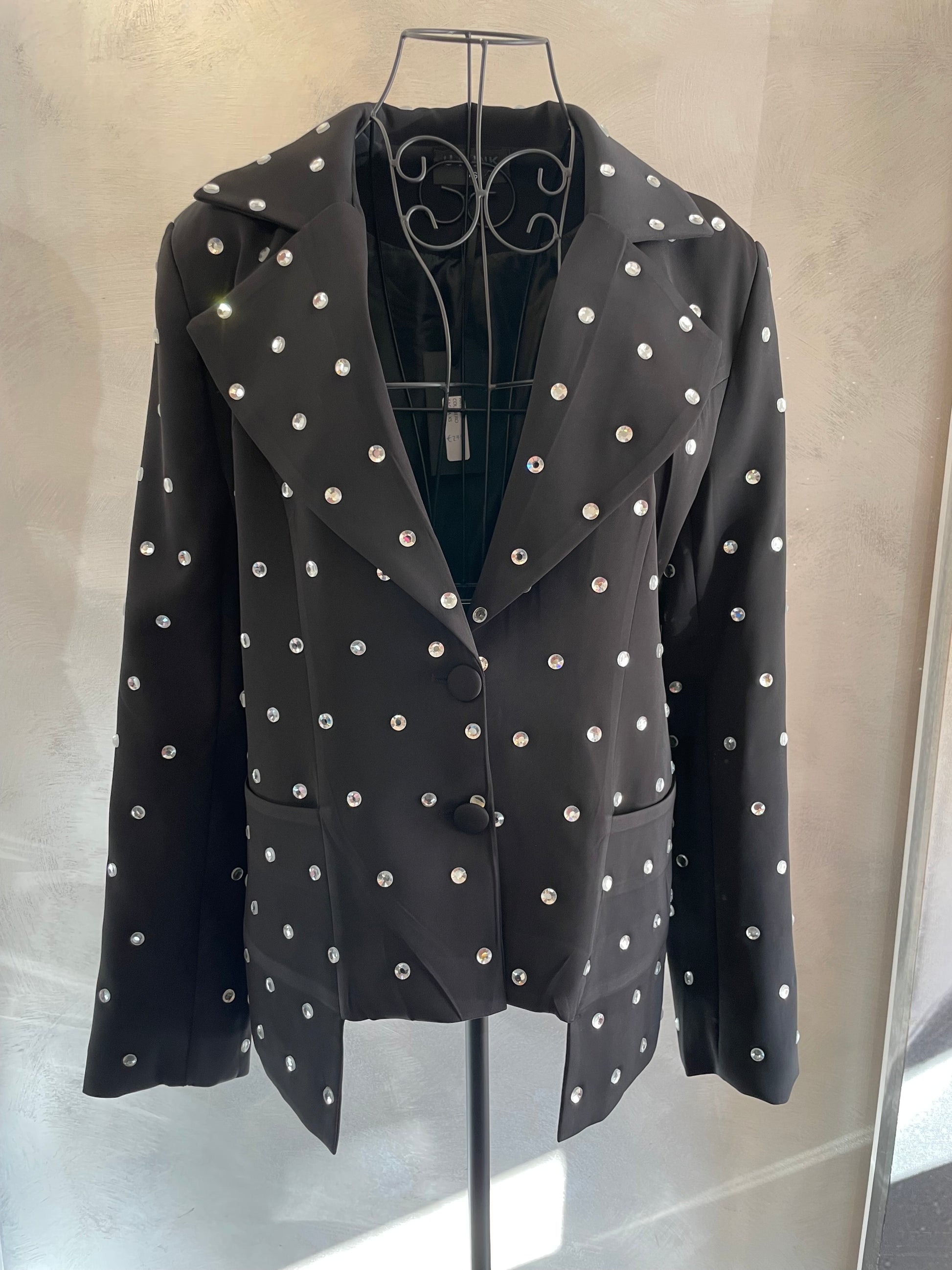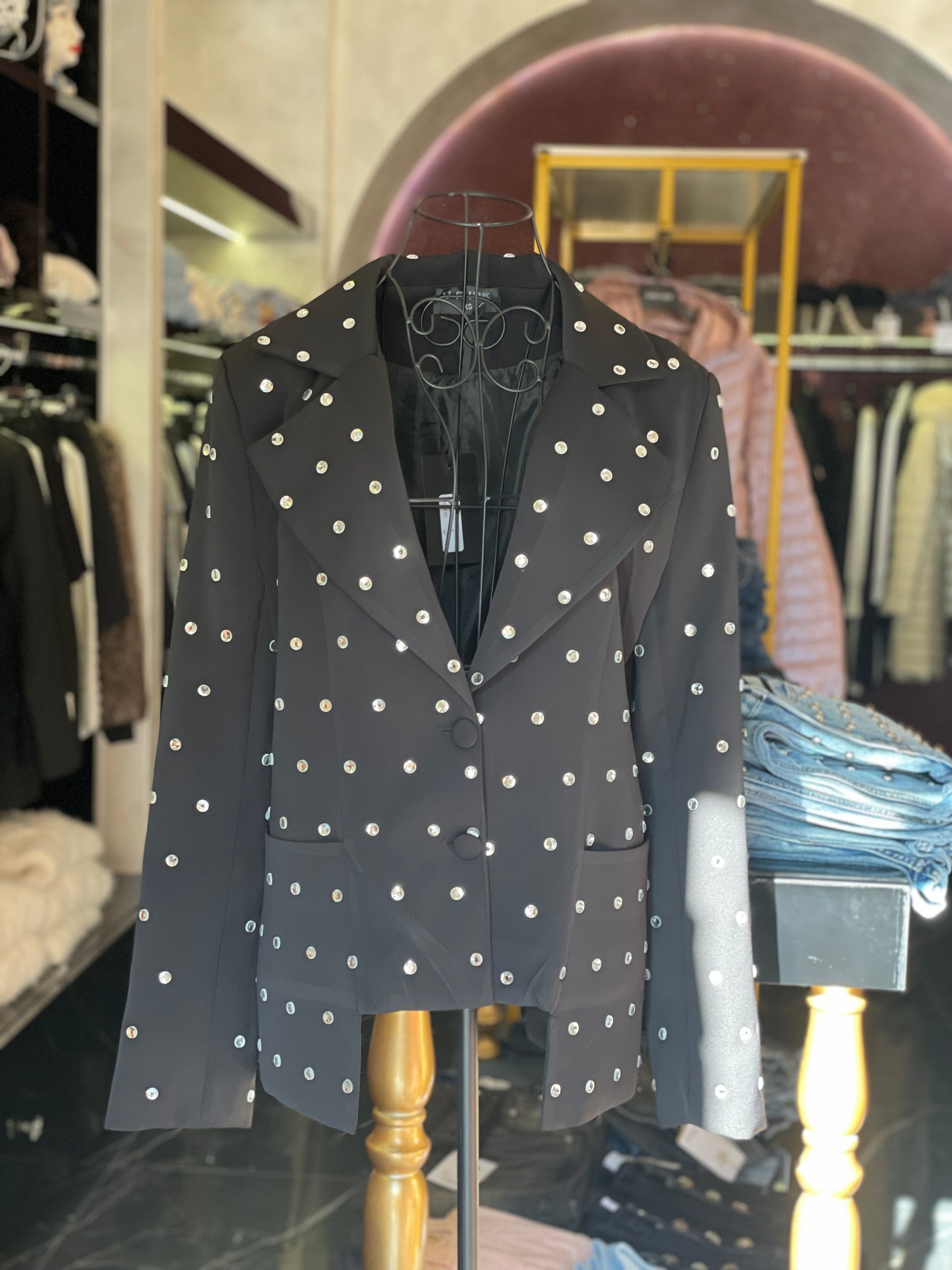 Giacca nera foderata internamente, ricca di pietre che ti faranno brillare come non mai. Giacca da abbinare a look eleganti da sera ma anche da sdrammatizzare con un jeans. Questa giacca ha un taglio sulle tasche irregolare voluto per renderla ancora più particolare.