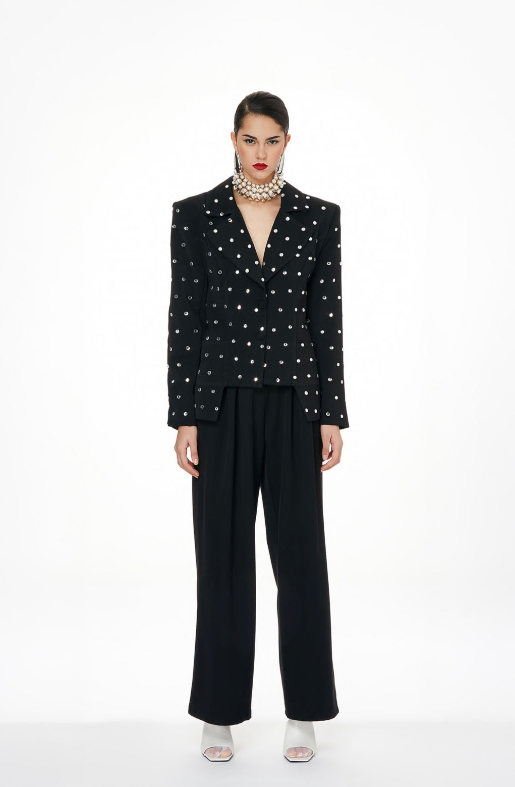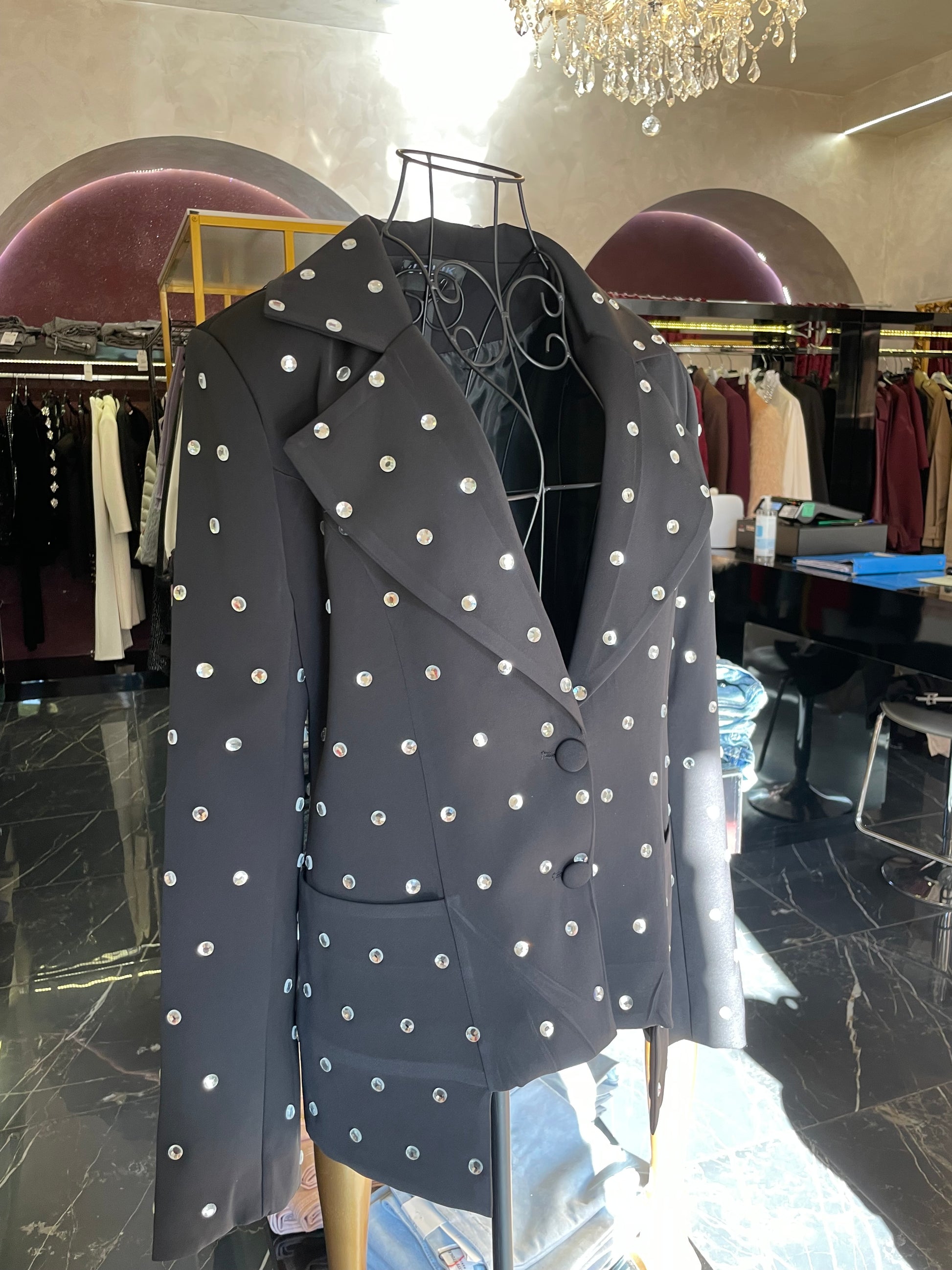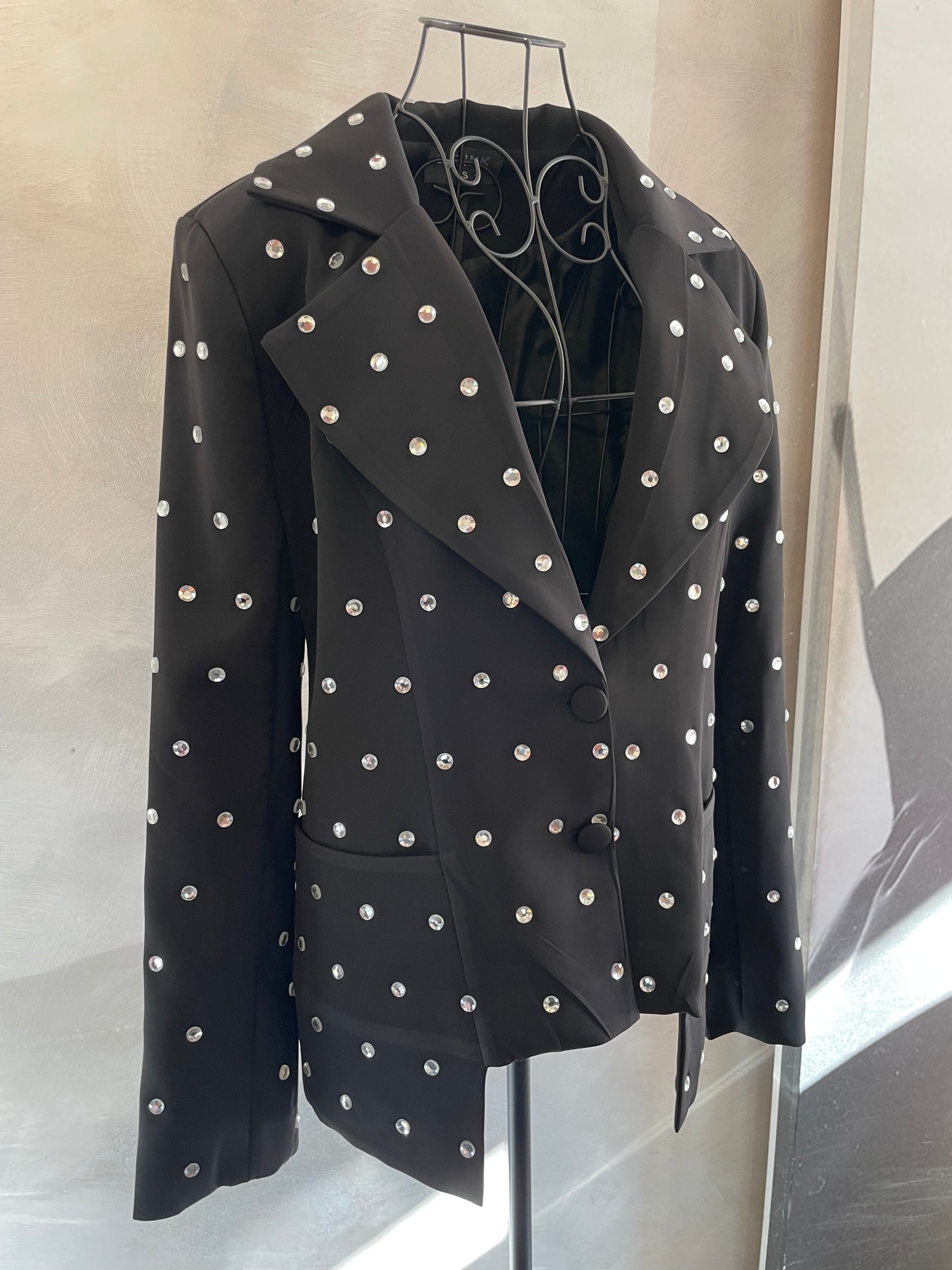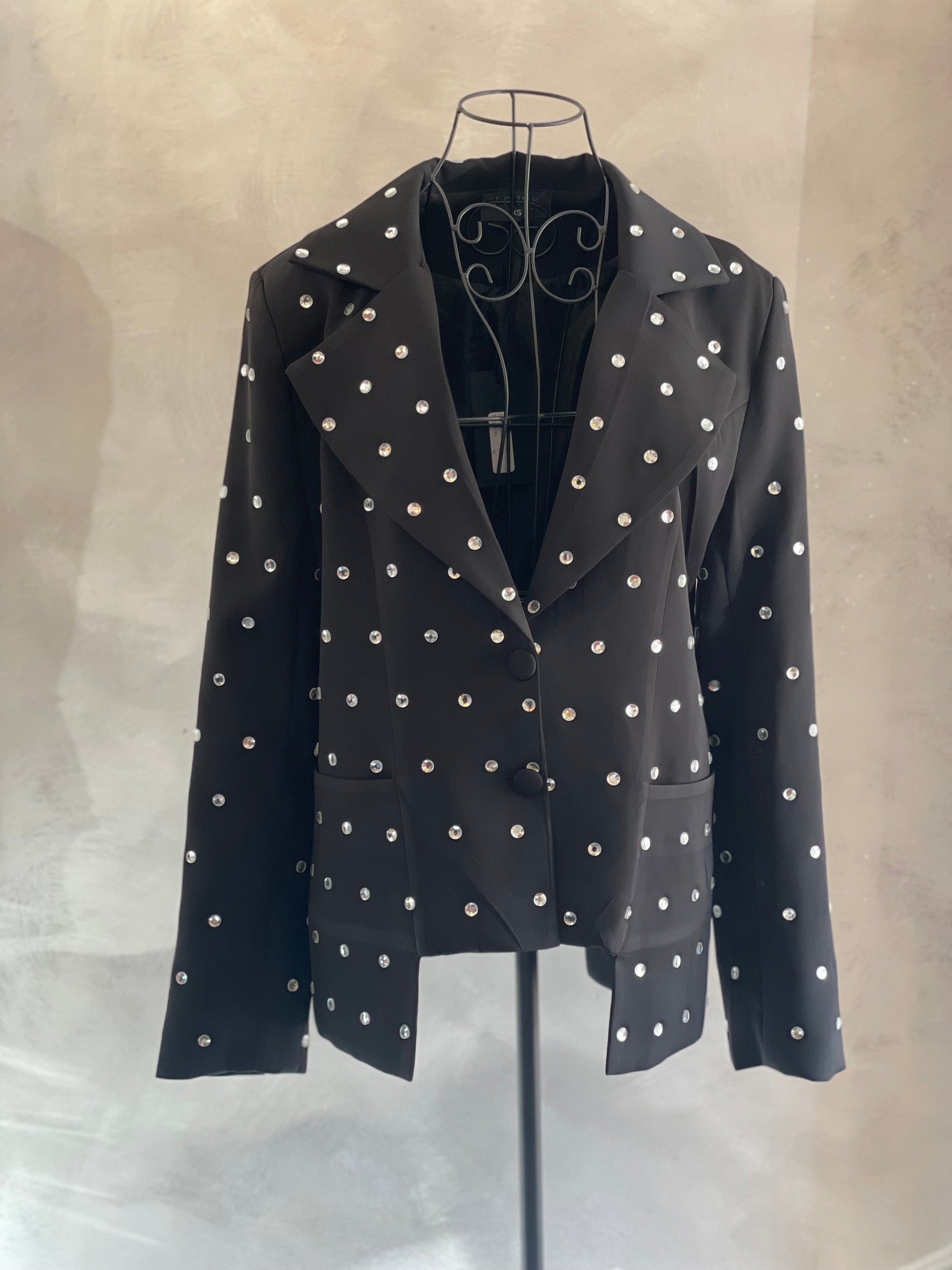 Giacca nera foderata internamente, ricca di pietre che ti faranno brillare come non mai. Giacca da abbinare a look eleganti da sera ma anche da sdrammatizzare con un jeans. Questa giacca ha un taglio sulle tasche irregolare voluto per renderla ancora più particolare.