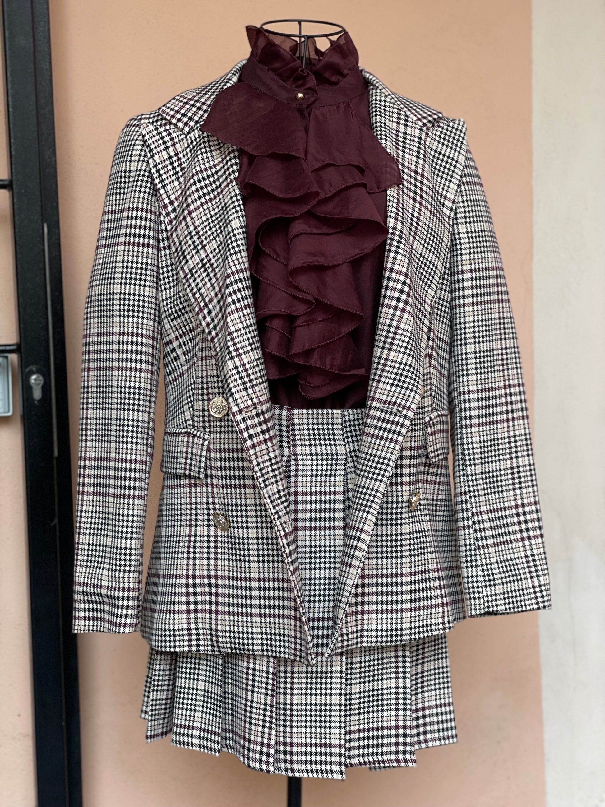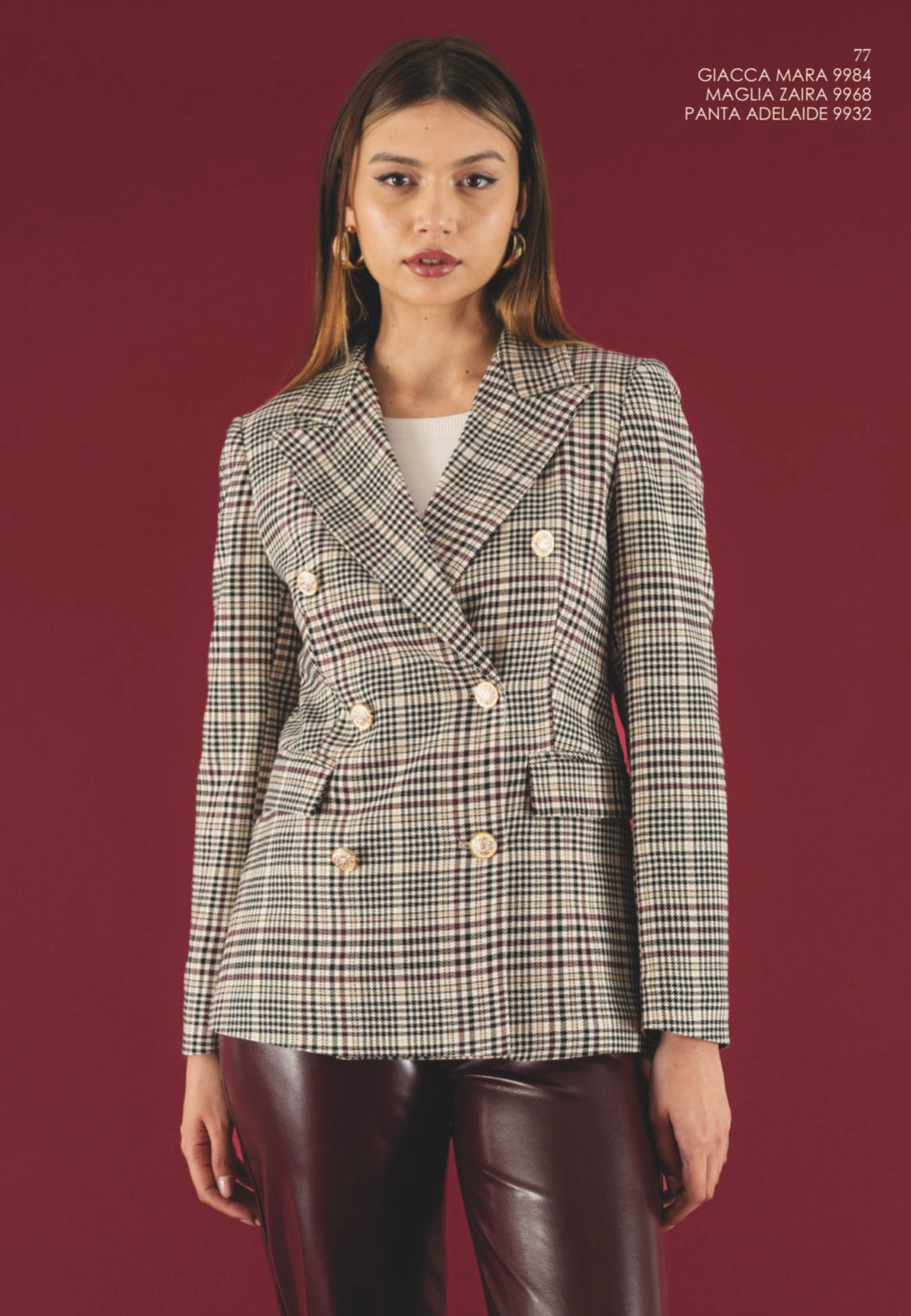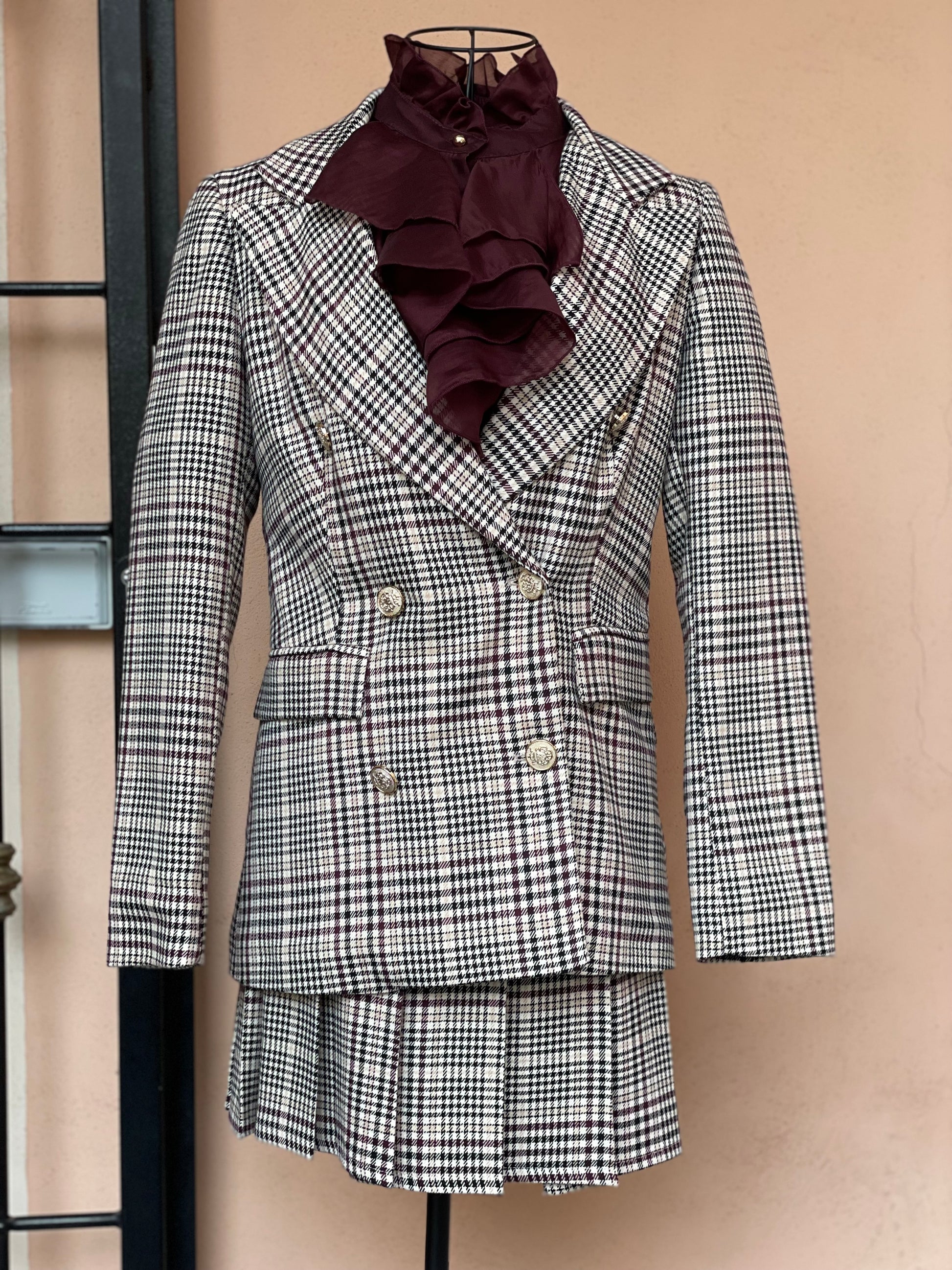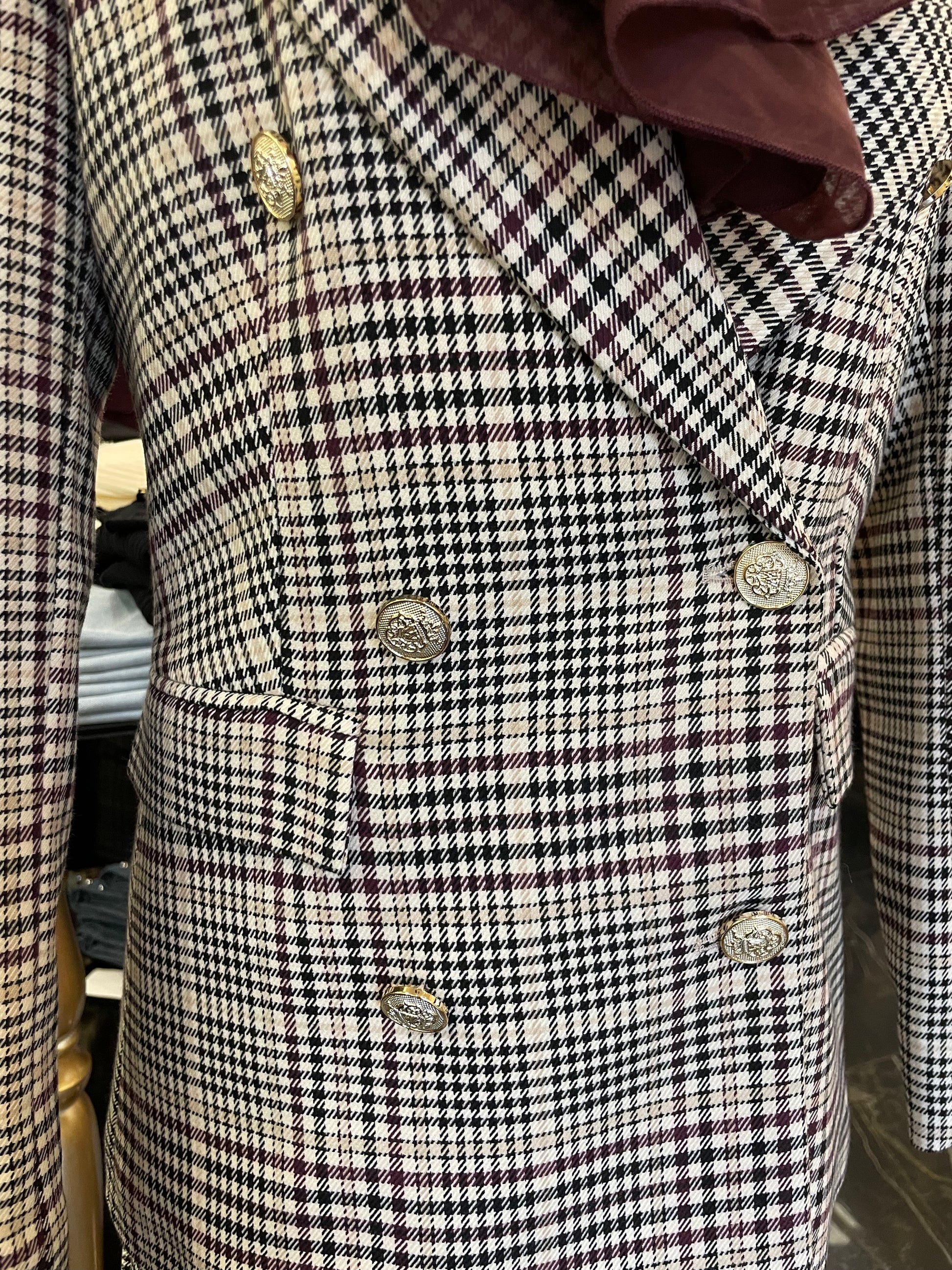 Giacca doppiopetto stampa check con bottone oro lavorato , foderata internamente. Bellissima con la sua gonna abbinata ma anche con un bel jeans per un look giornaliero e pratico.