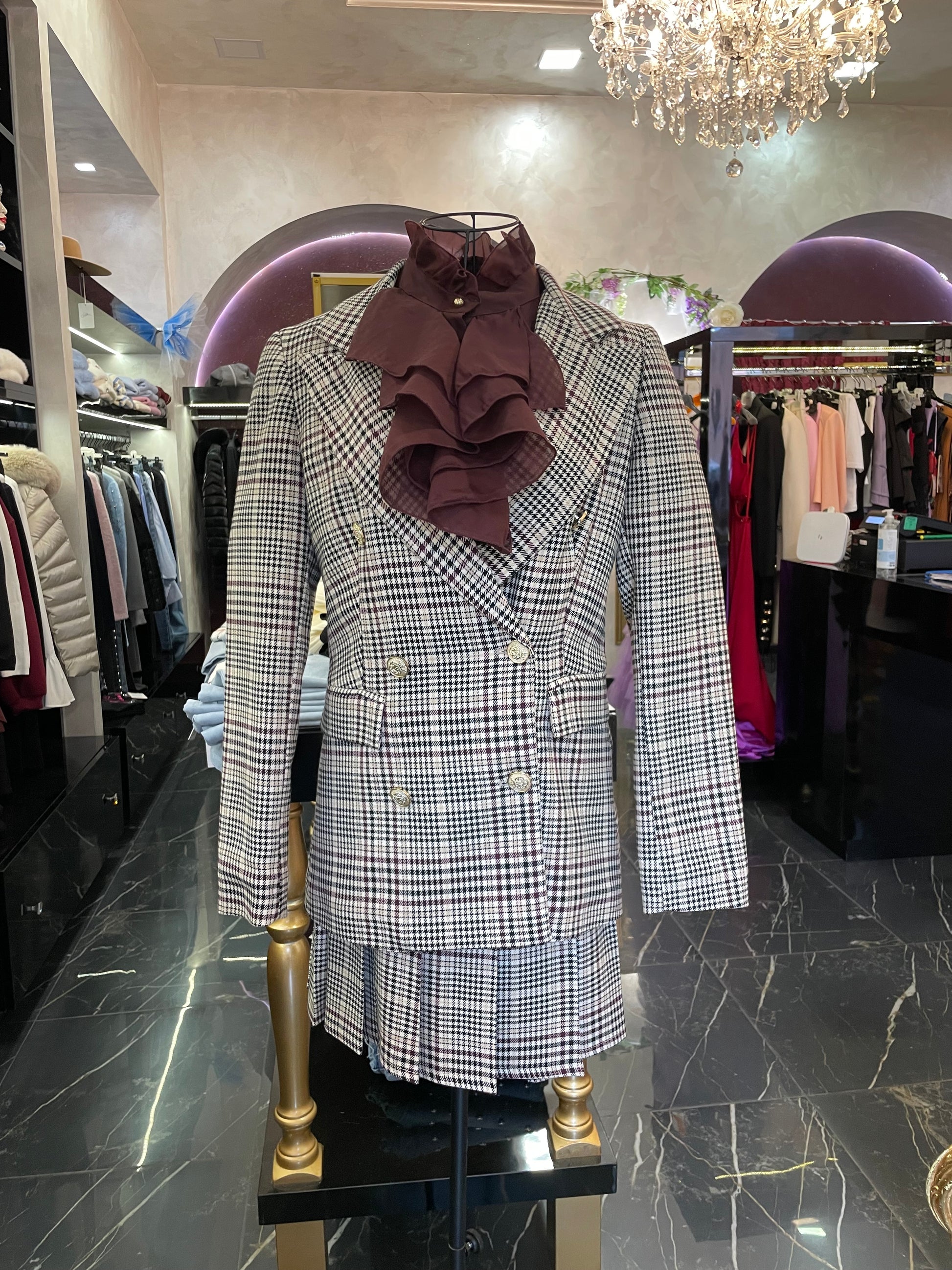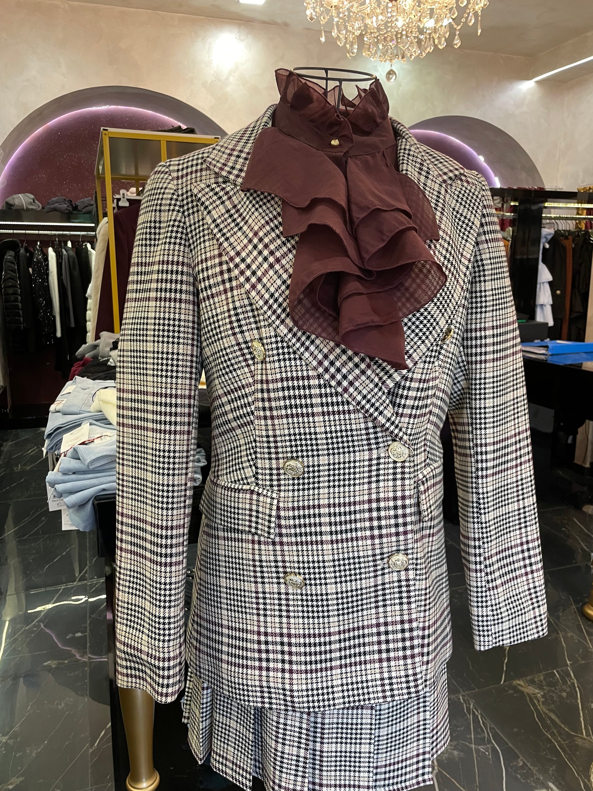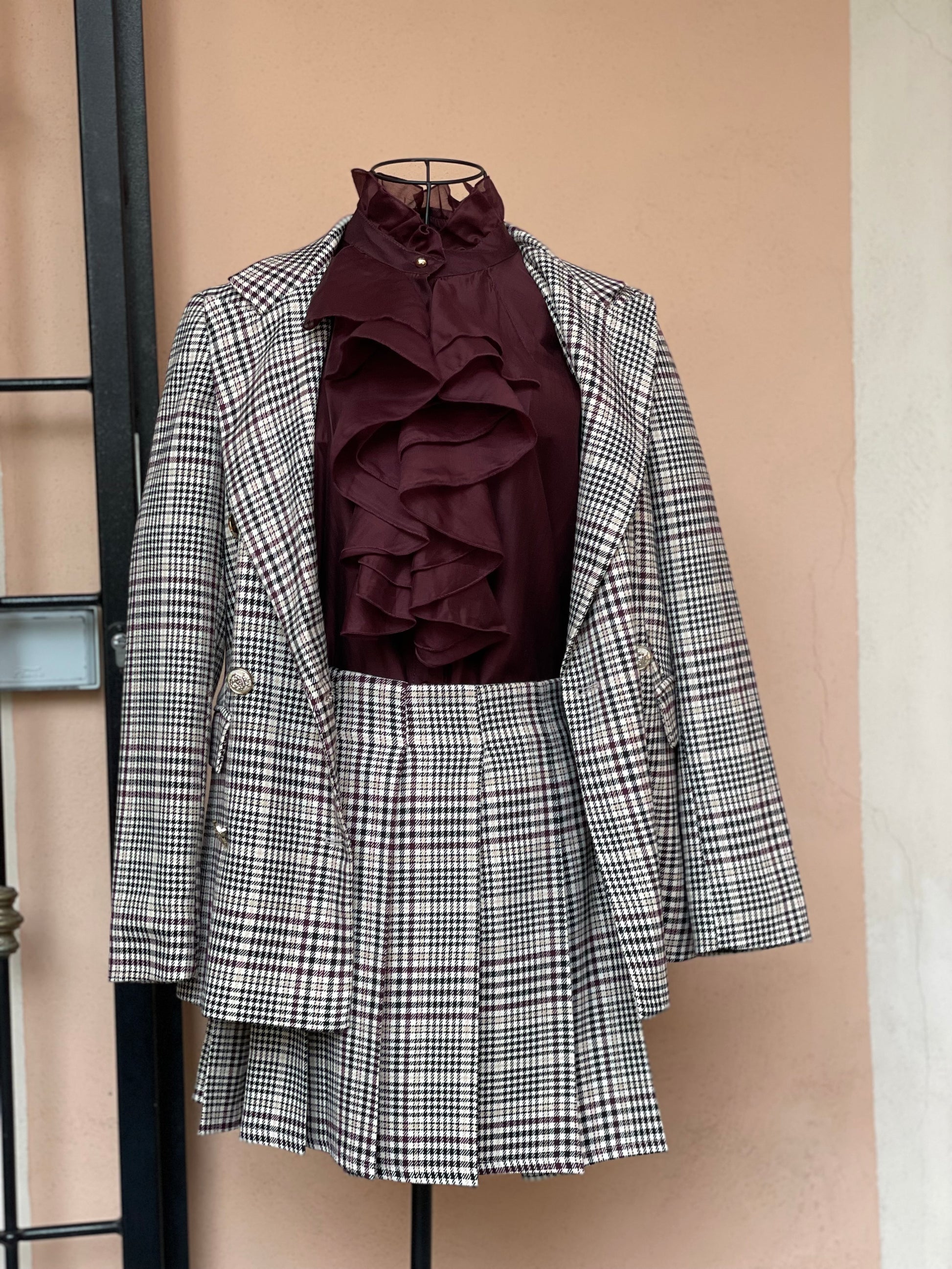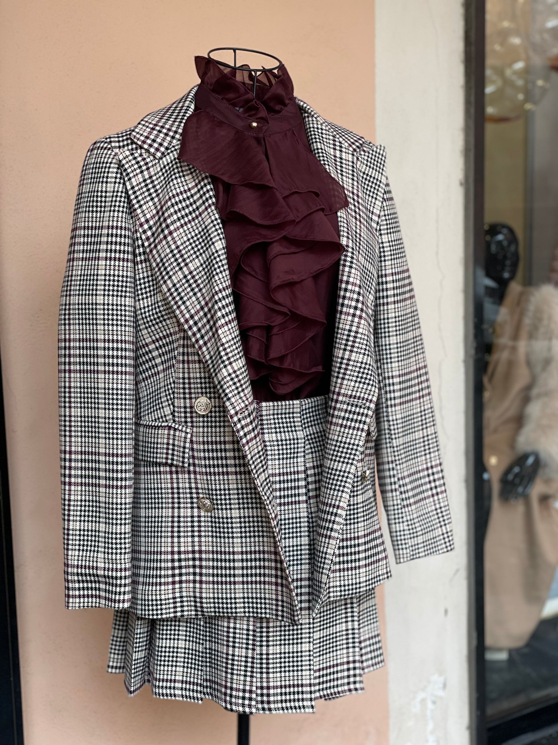 Giacca doppiopetto stampa check con bottone oro lavorato , foderata internamente. Bellissima con la sua gonna abbinata ma anche con un bel jeans per un look giornaliero e pratico.