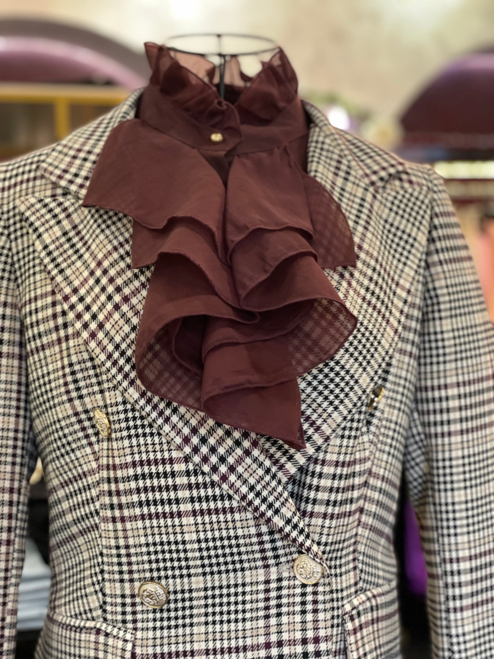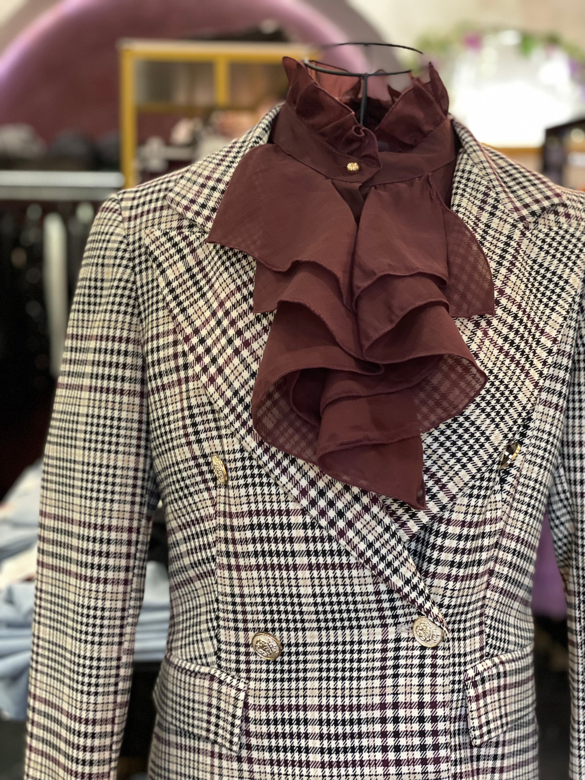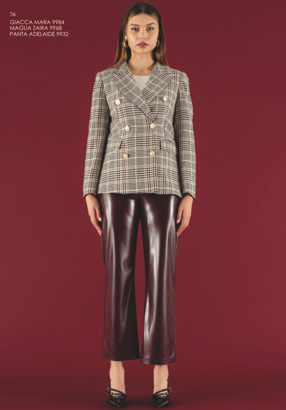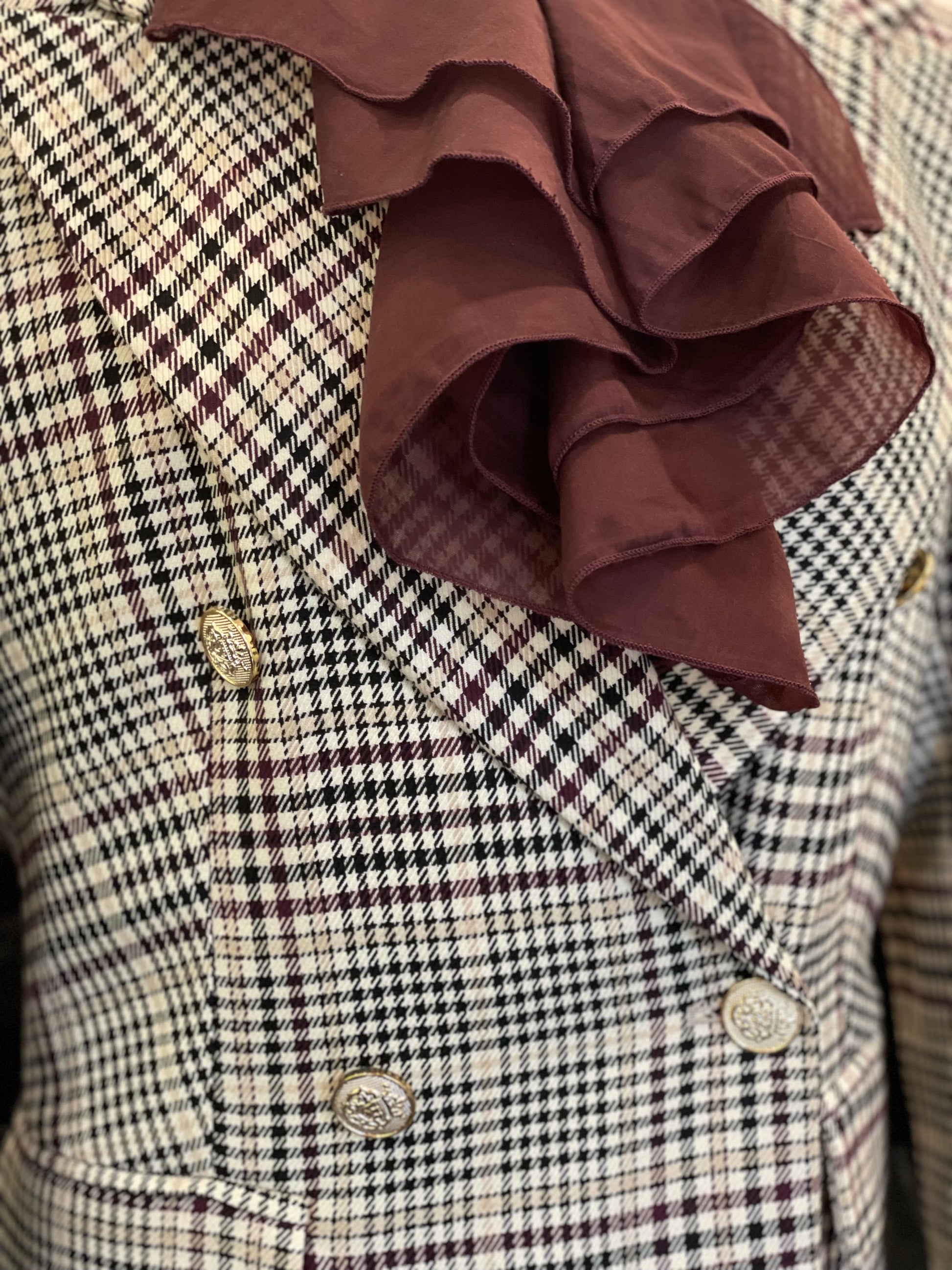 Giacca doppiopetto stampa check con bottone oro lavorato , foderata internamente. Bellissima con la sua gonna abbinata ma anche con un bel jeans per un look giornaliero e pratico.