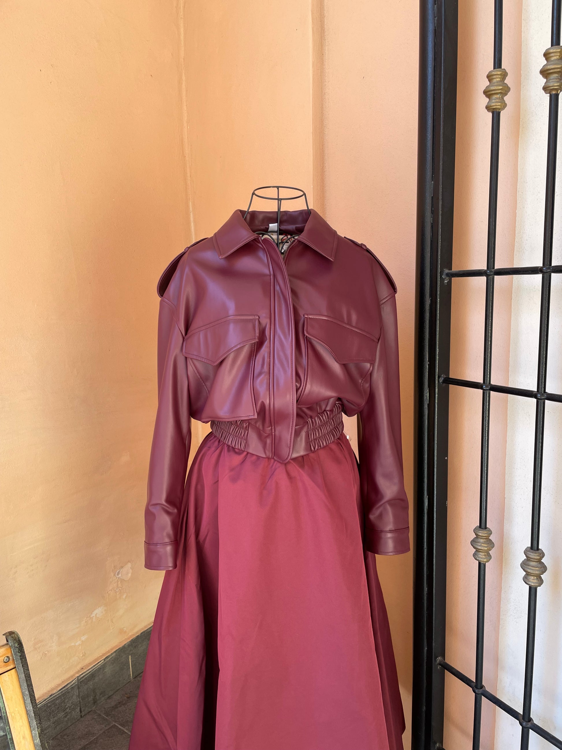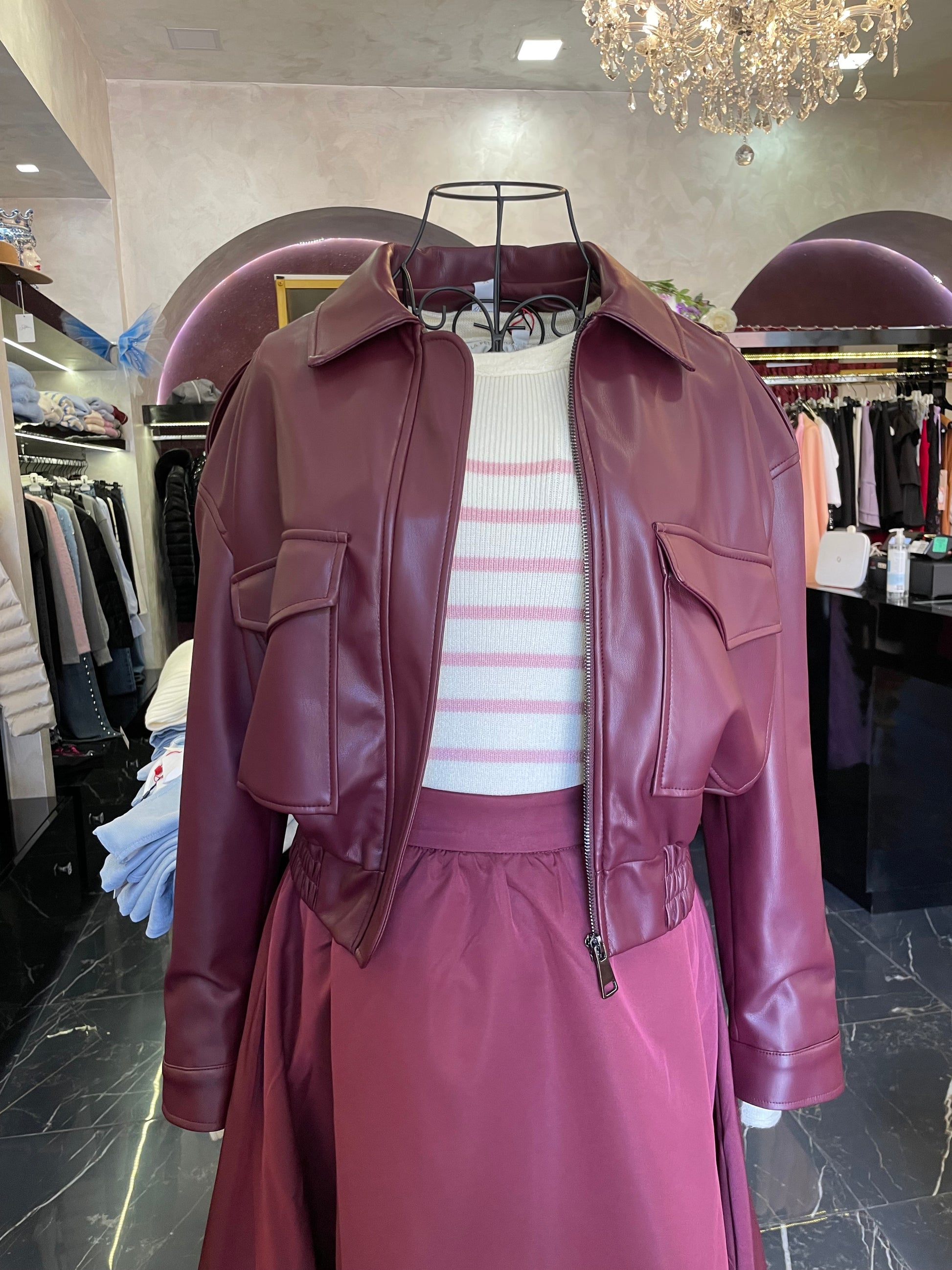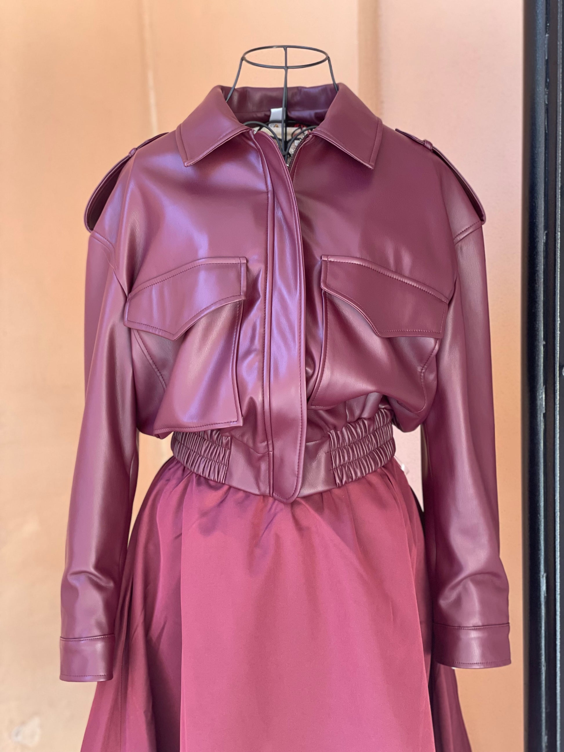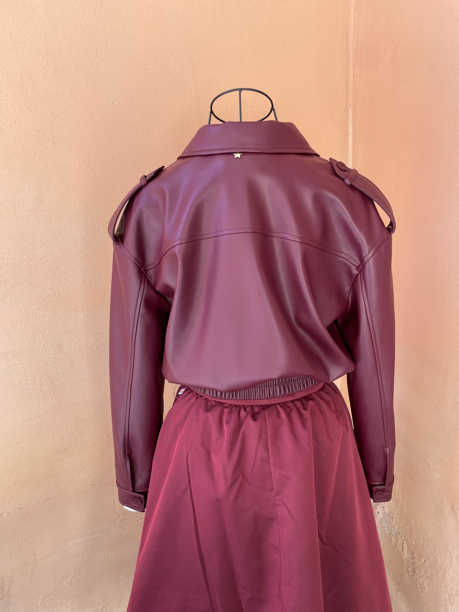 Giubbino in ecopelle bordeaux, zip sul davanti , pattine con bottone sulle spalle , elastico stretto in vita. Tasche sul davanti . Foderato internamente.