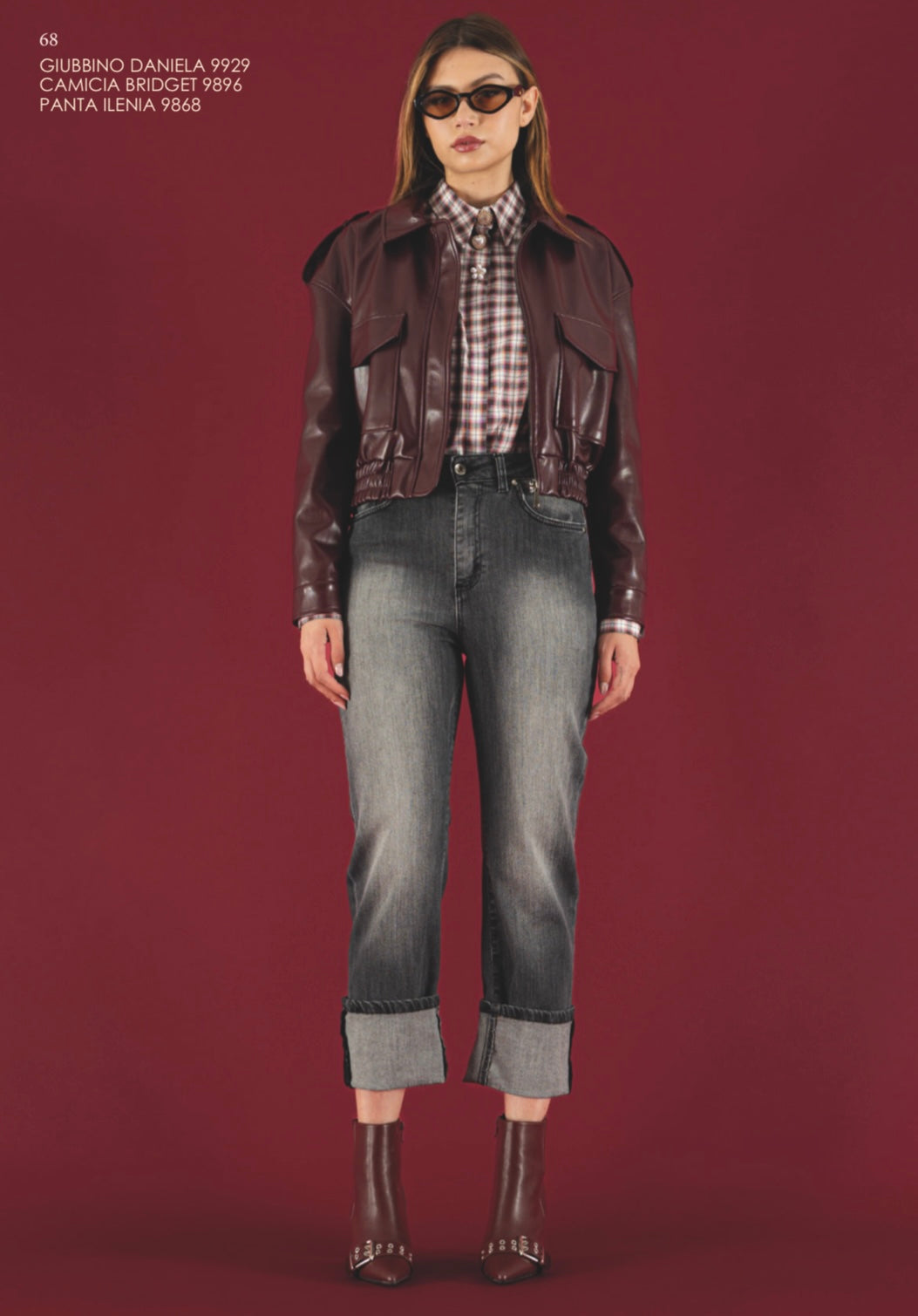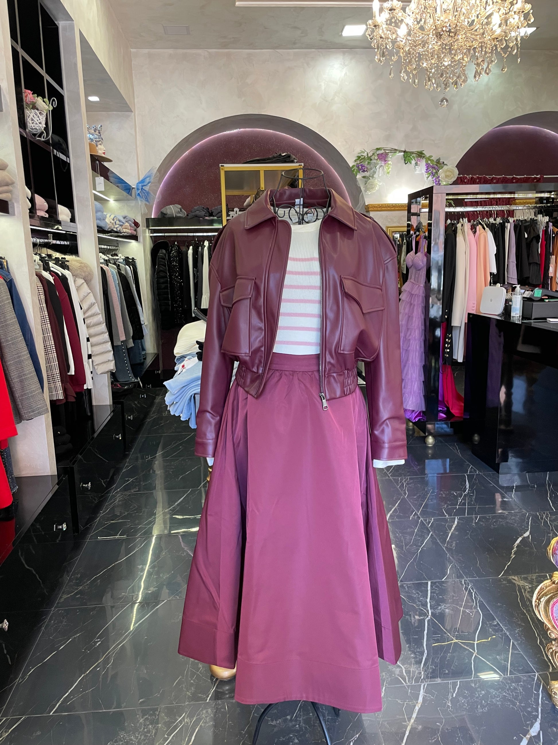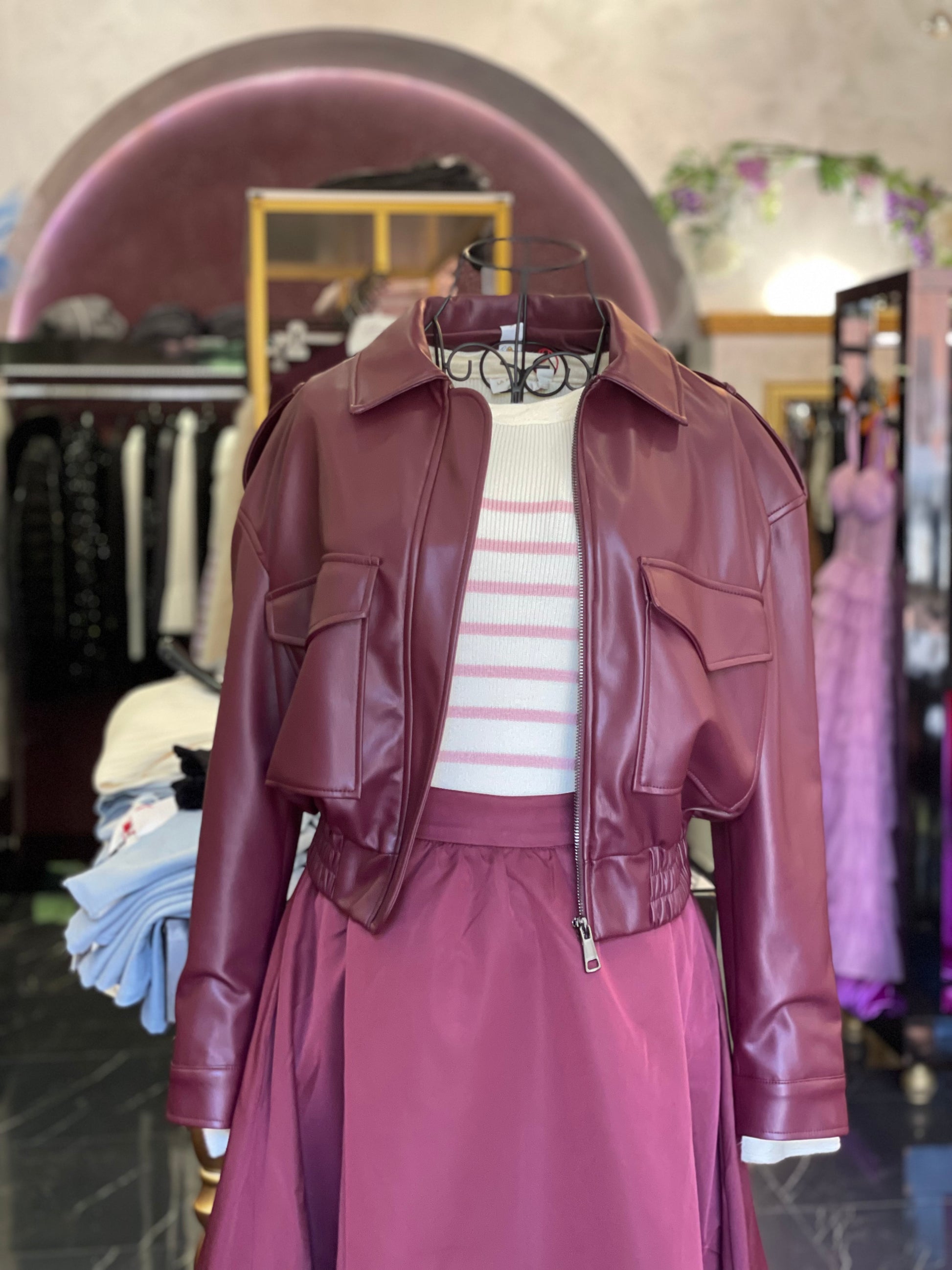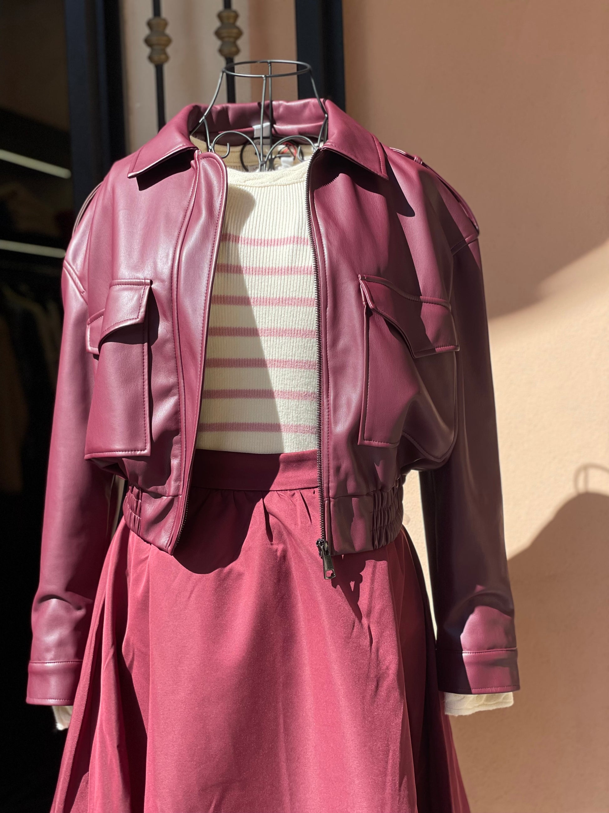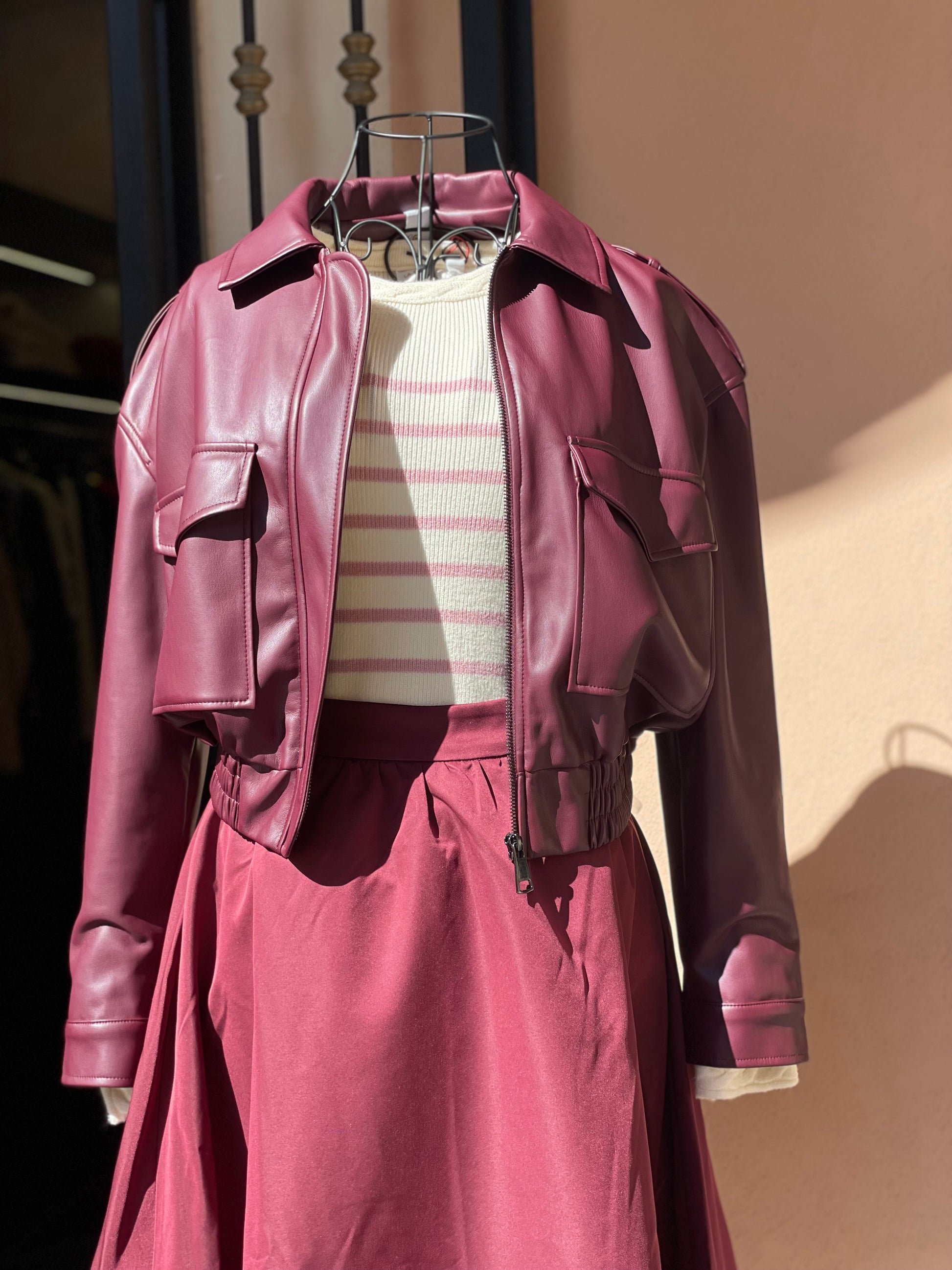 Giubbino in ecopelle bordeaux, zip sul davanti , pattine con bottone sulle spalle , elastico stretto in vita. Tasche sul davanti . Foderato internamente.