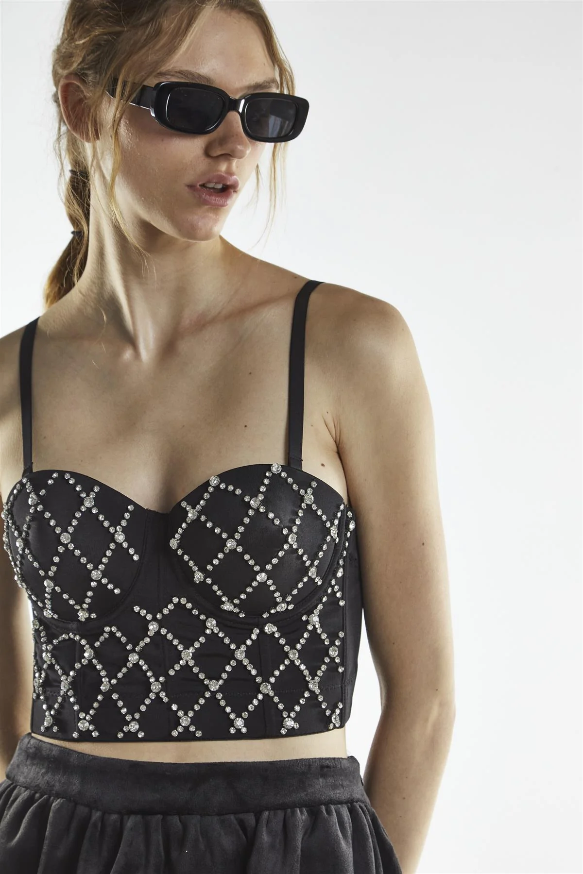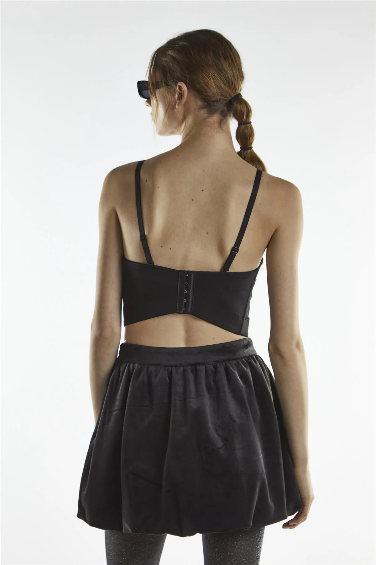 Gonna corta in velluto nera modello leggermente a palloncino. Bellissima abbinata al suo bustino con pietre ma anche con un maglione colorato e stivaletto basso per un look più casual.