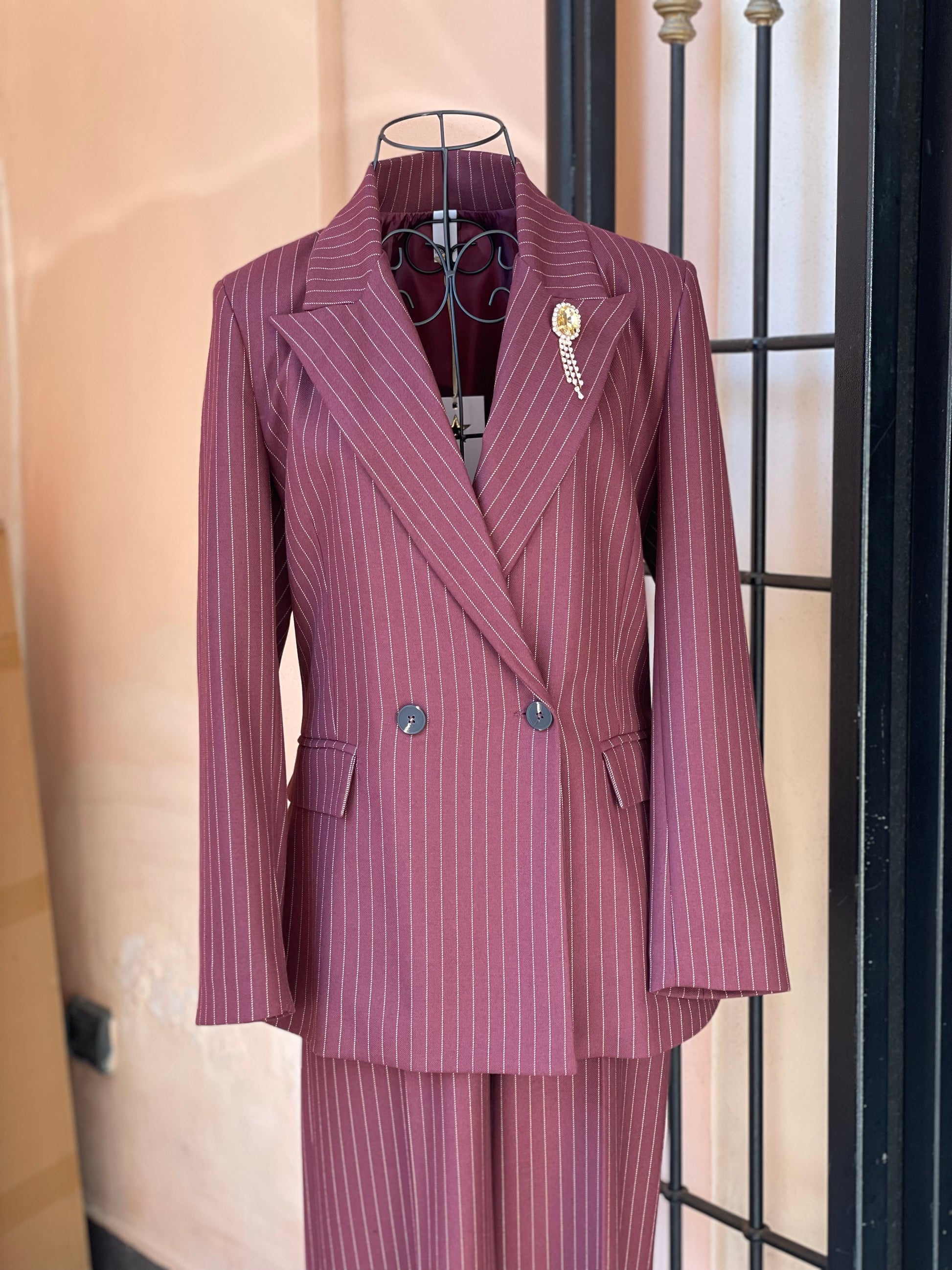 Pantalone vita alta modello palazzo con gamba ampia , gessato bordeaux, bellissimo abbinato alla sua giacca Alice .