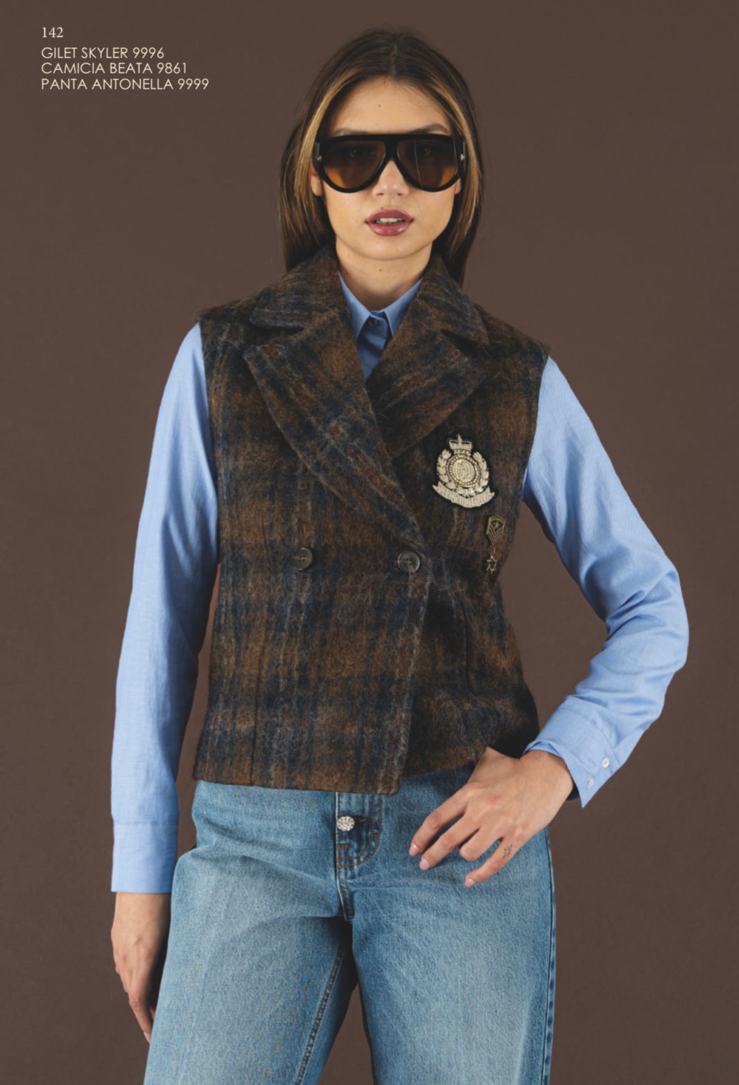 Jeans vita alta con dettagli bottoni gioiello e gamba dritta. Lavaggio medio chiaro.