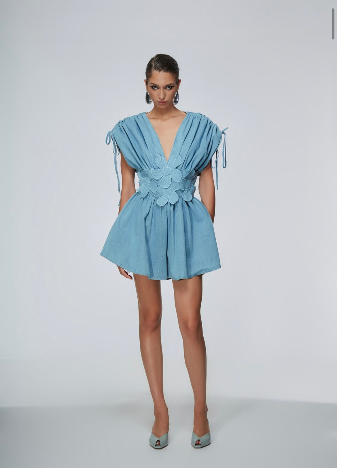 Tutina corta in denim che sembra un abito, dettaglio dei fiori applicati sul punto vita. Scollatura a V. Parte elasticizzata sul punto vita. Zip sul retro.