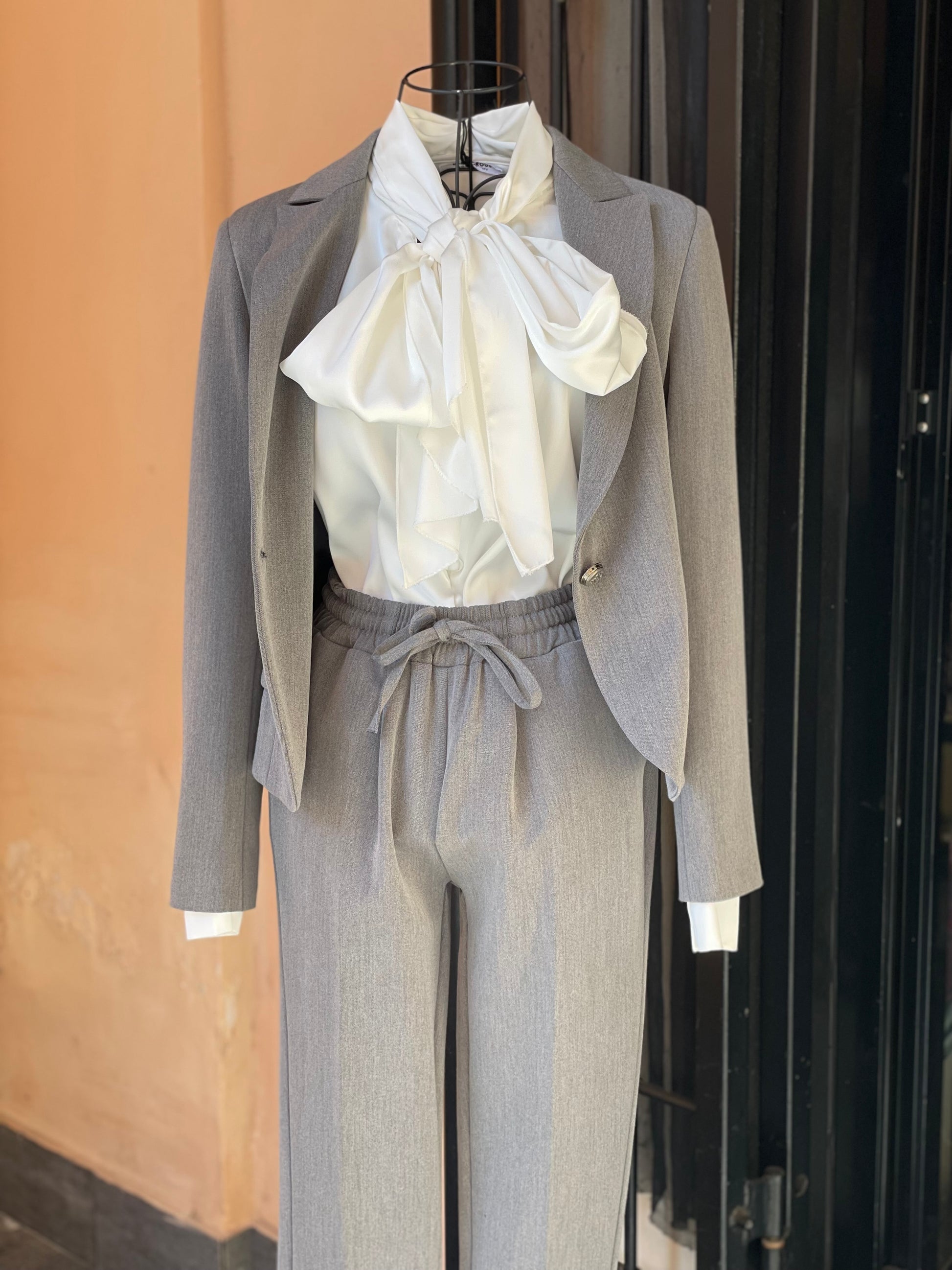 Completo tailleur giacca e pantalone. Giacca foderata internamente vestibilitá avvitata. Pantalone con elastico in vita e taglio dritto. Questo è un tailleur da utilizzare per tutti i giorni perché è comodo e pratico e non risulta impegnativo.